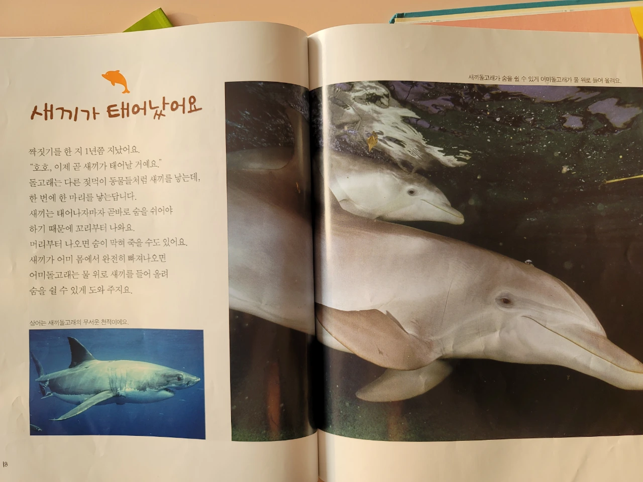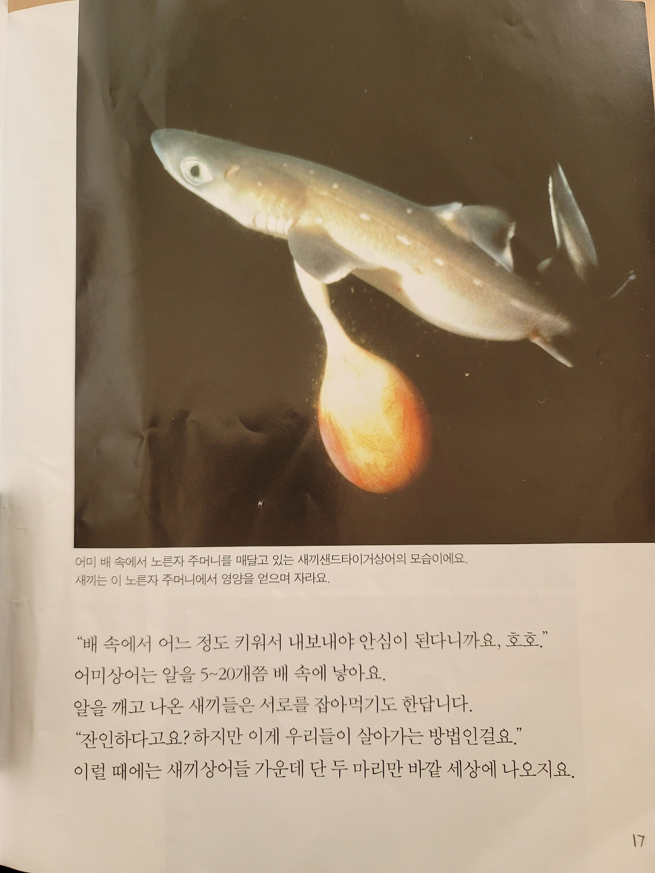 “음……. 보자, 아니네. 상어 엄마는 아기를 뱃속에서 오래 품고 있고, 세상에 내어놓고 나면 떠난대.”
