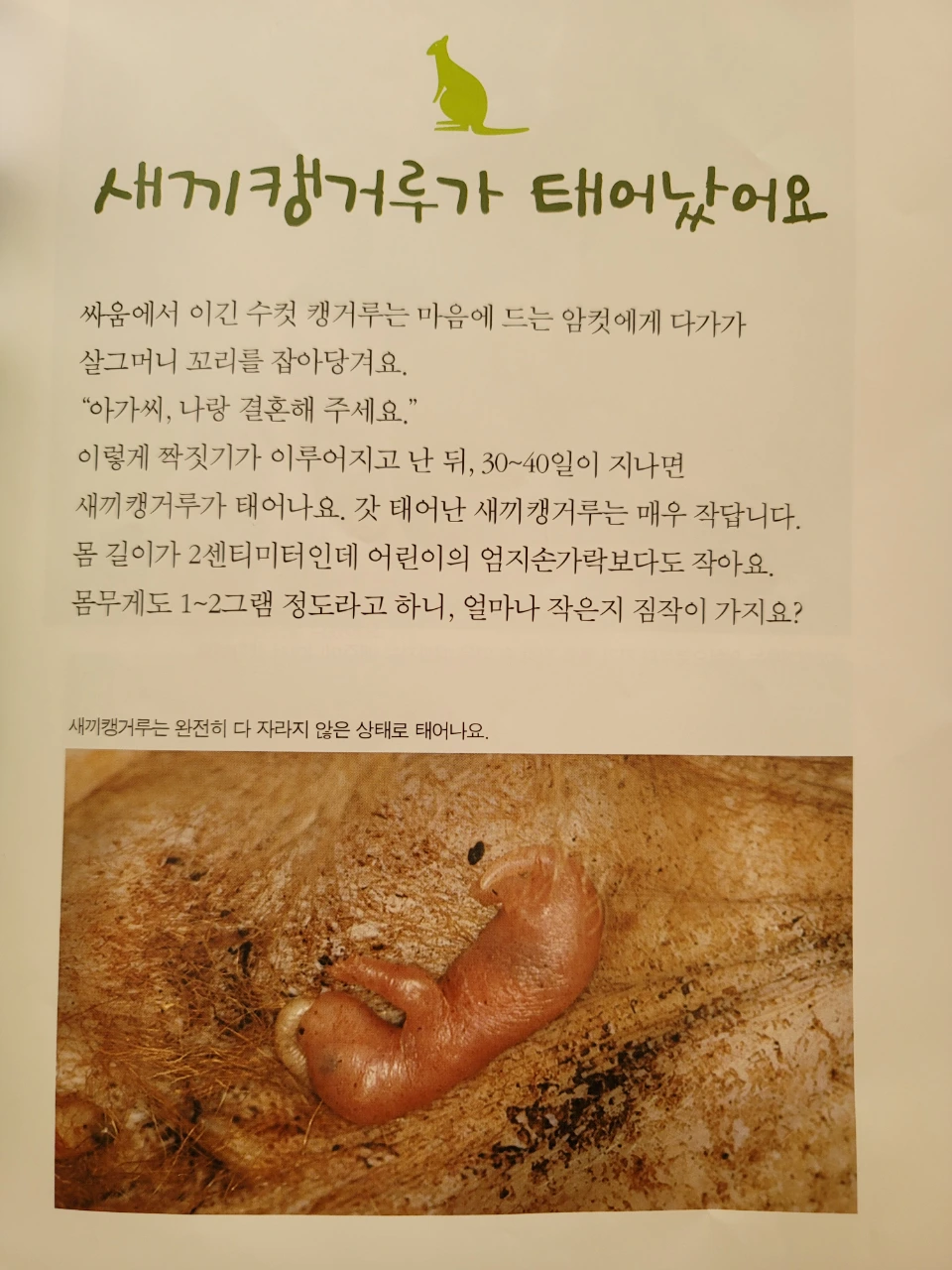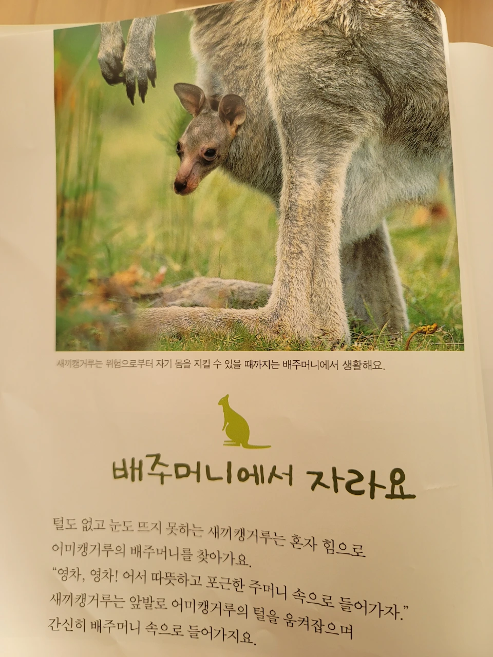 “응, 아기 캥거루는 태어날 때 너무 작고 약해서 엄마 캥거루가 주머니에 넣고 잘 돌봐준대.”