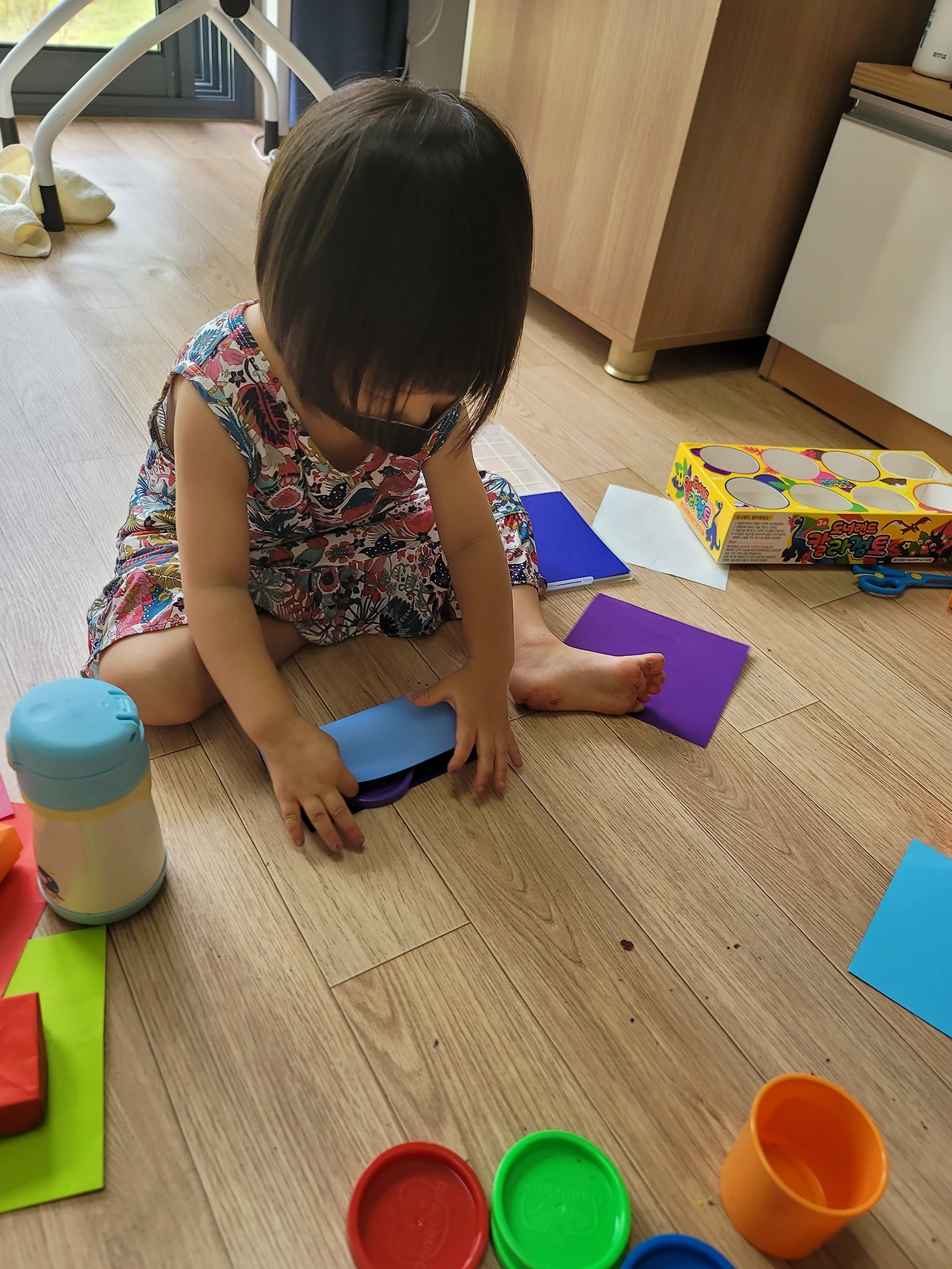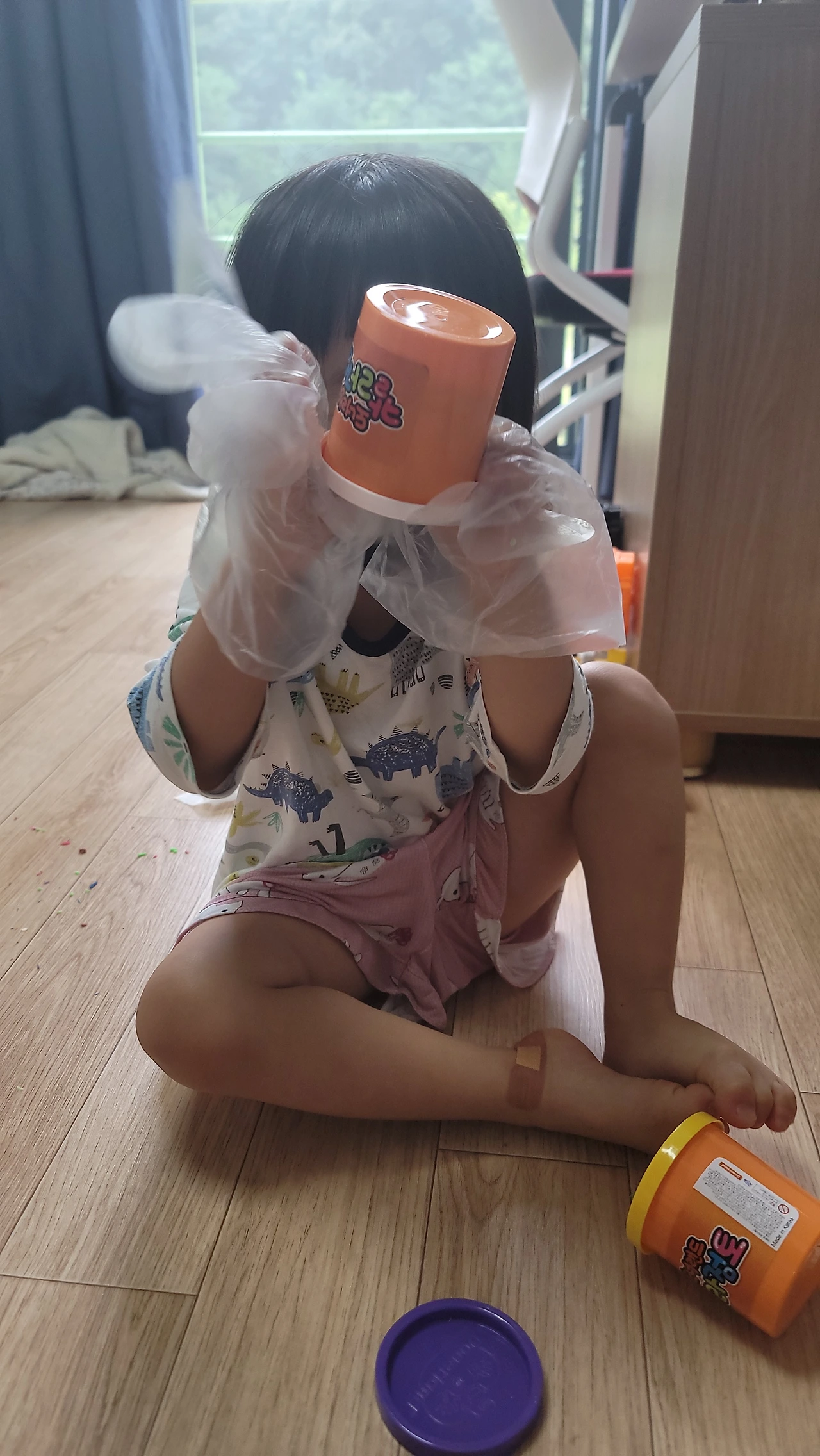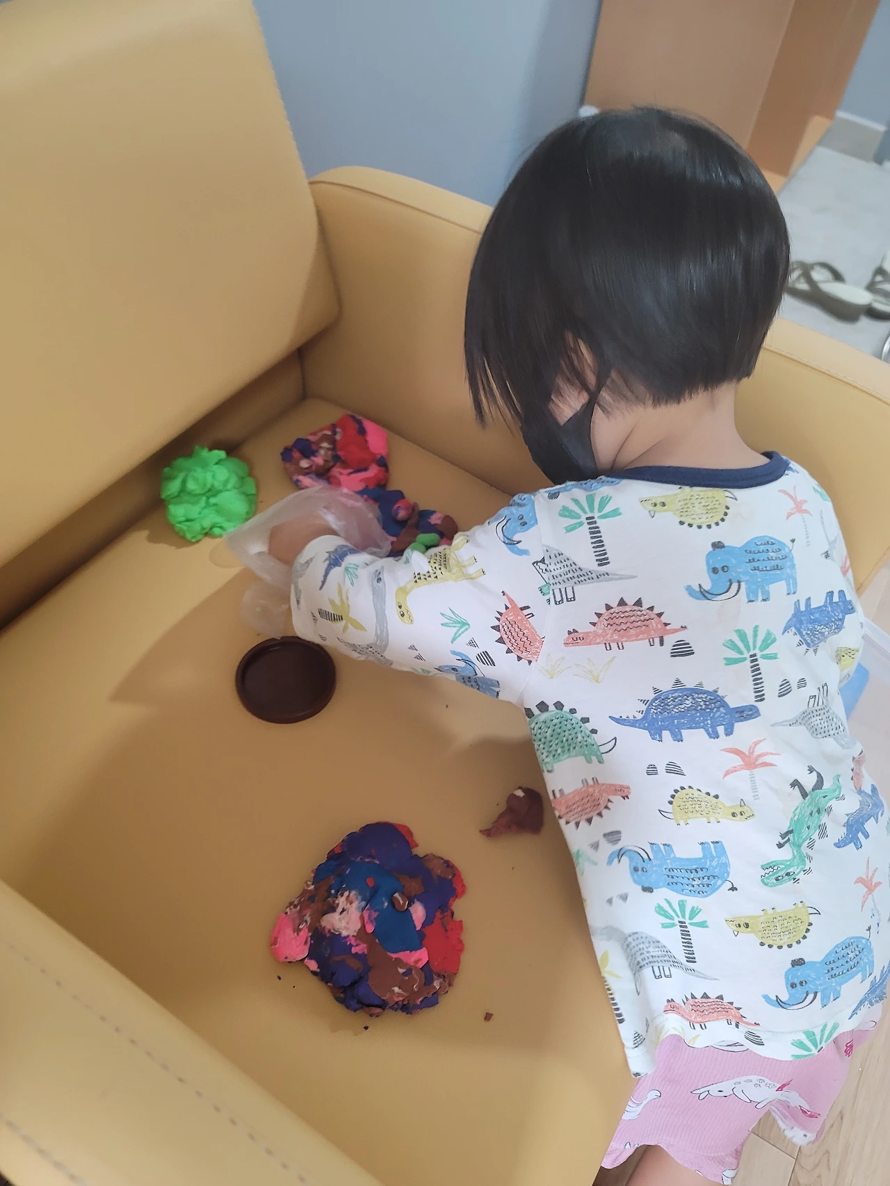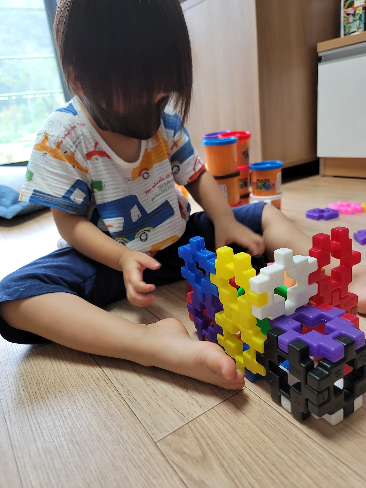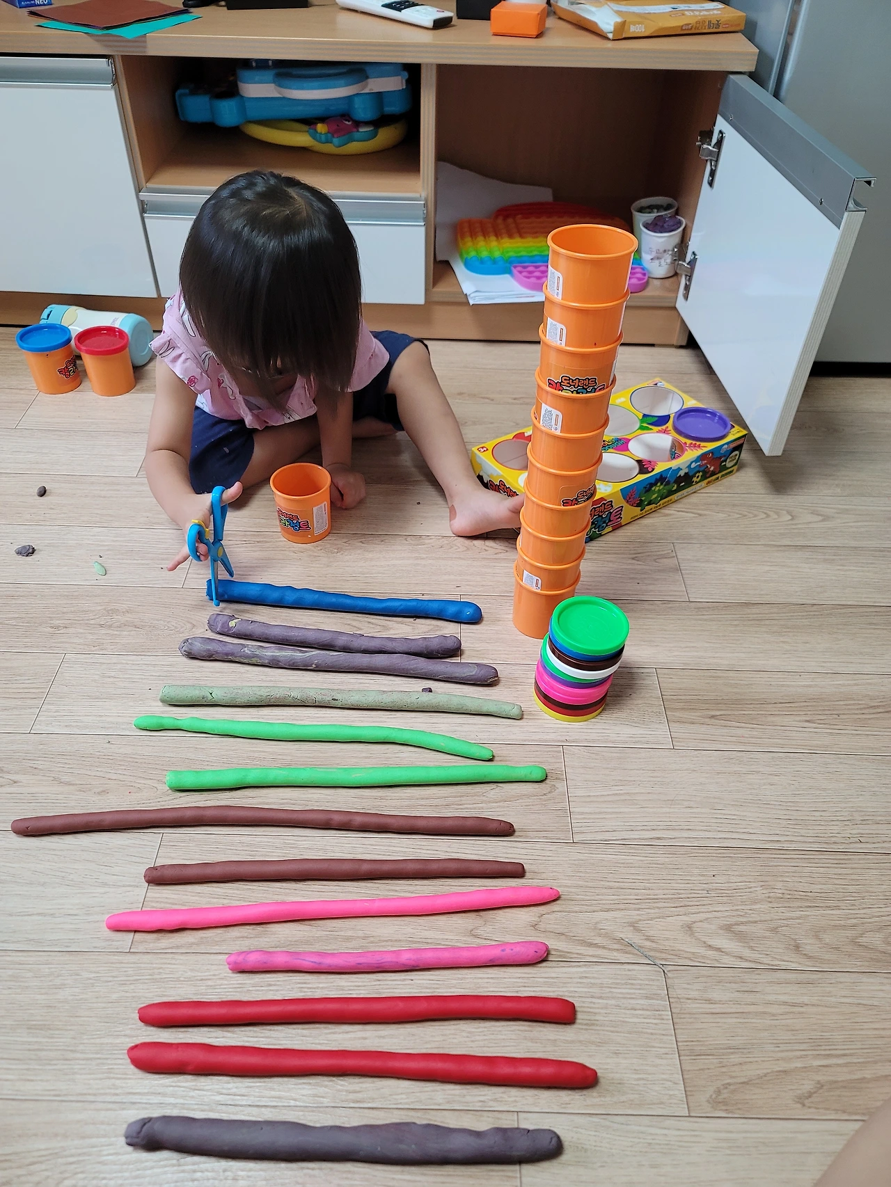 비슷한 놀잇감으로 이런저런 놀이를 구상해서 하는 것도 놀랍다. 6일째쯤 되니 좀 지루하고 심심하기도 한지 핑크퐁, 콩순이, 로보카 폴리 등을 전보다 자주 찾기는 한다. 그래도 하루 두세 번 정해진 시간에 만화를 보는 거 외에는, 같은 놀잇감으로 이래저래 잘도 논다. 클레이만 하더라도 처음엔 요리놀이만 하더니, 이내 자르고 담는 놀이를, 색깔별 분류 놀이를, 가게놀이를, 던지고 받는 공놀이까지 한다. 노는 내내 내가 놀이 상대가 되어야 하지만, 아이가 안 아픈 것만으로도 감사해서 성실하게 놀이 상대가 돼주는 중이다.