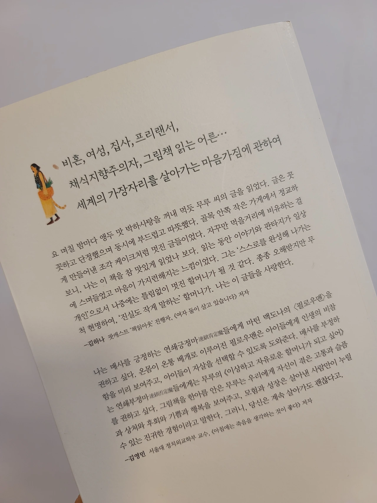 관계에 대해 생각할 때 나는 사람 인人자를 떠올린다. 홀로 설 수 없어서 기댄 두 사람의 형상을 빗대어 만들었다는 이 글자를 보면 궁금하다. 삶의 기본값은 ‘함께’인가. 그러기에 인생은 너무 길고 각자의 삶은 너무나 다르지 않은가. 서로 어깨를 두르거나 손을 잡고 함께 걸어도 좋지만 우선은 혼자 잘 서야 하지 않는가. 나에게 사람인의 두 획은 넓게 벌린 발이다. 씩씩하게 걸어가는 한 사람의 다리 말이다. 우리는 각자의 길을 걷다가 가끔은 누군가를 만나 함께 걷거나 서로의 손을 잡아줄 수 있다. 그런 시간들이 얼마나 아름다운지 나도 안다. 그러나 기왕이면 혼자서도 잘 걷는 길이면 좋겠다. 좋은 사람들이 어딘가에서 나타났다가 또 어딘가로 사라지더라도, 우선은 혼자서, 두 발로, 씩씩하게 걷고 싶다.(70쪽)
