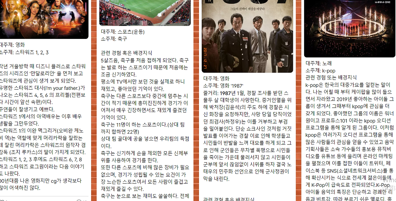 ‘내가 잘 알고 있다고 생각해서 고른 주제였는데 막상 쓰려고 하니 아는 것이 별로 없다는 것을 깨달았다. 이번 기회에 내 관심사에 대해서 더 구체적으로 알아볼 수 있어서 뜻깊었다.’
