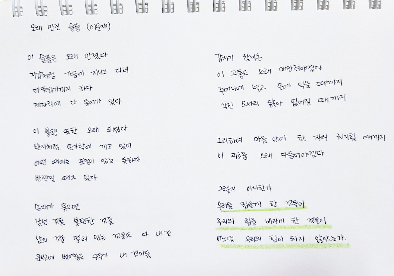 슬픔의 한복판을 관통하고 있는 이에게 “힘 내.”, “잘 될 거야,”라는 진부한 조언 대신에 예쁜 엽서에 이 시를 곱게 필사해서 내밀어 보시는 건 어떨까요. 지금 겪는 슬픔을 잘 품고 소중히 만져, 슬픔의 각진 모서리가 매끄럽게 깎여나갈 때쯤이면 지금의 너보다 더 강하고 단단한 네가 되어 있을 거라는 마음을 담아서요.