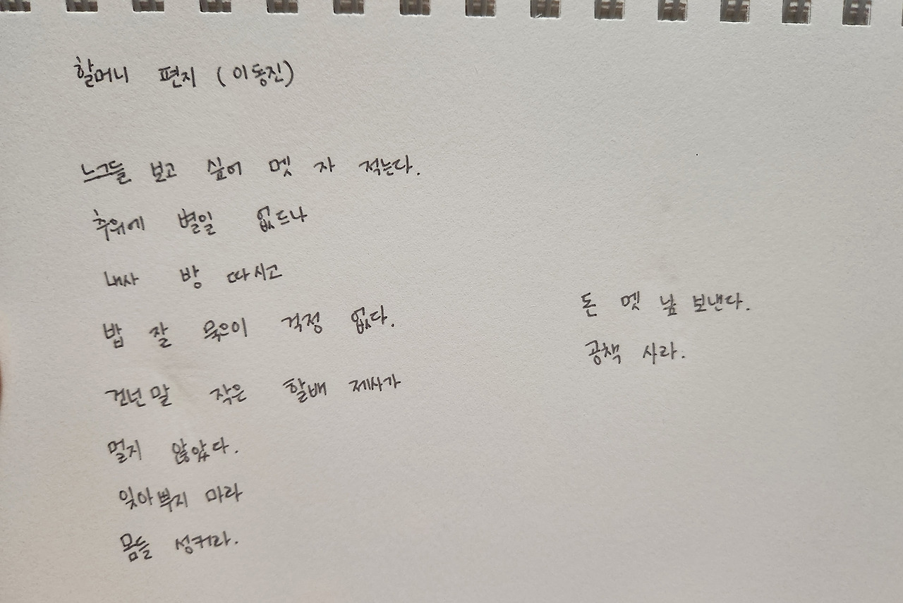 ‘할머니 편지’의 마지막 연 '돈 멧 닢 보낸다/공책 사라', 이 투박한 진심 앞에서 속수무책일 수밖에 없었던 것은, 바로 할머니의 ‘잘 살라’는 말이 떠올라서였습니다. ‘돈 멧 닢 보낸다/공책 사라’는 말에 숨은 마음은 ‘얼마 되지 않는 가진 것을 내어 너에게 보내니, 그것으로 네가 나아지는 무언가를 하라’는 것이 아닐까요. 우리 할머니가 제게 건네는 마지막 말, ’잘 살라‘는 당부의 또 다른 표현 같습니다.