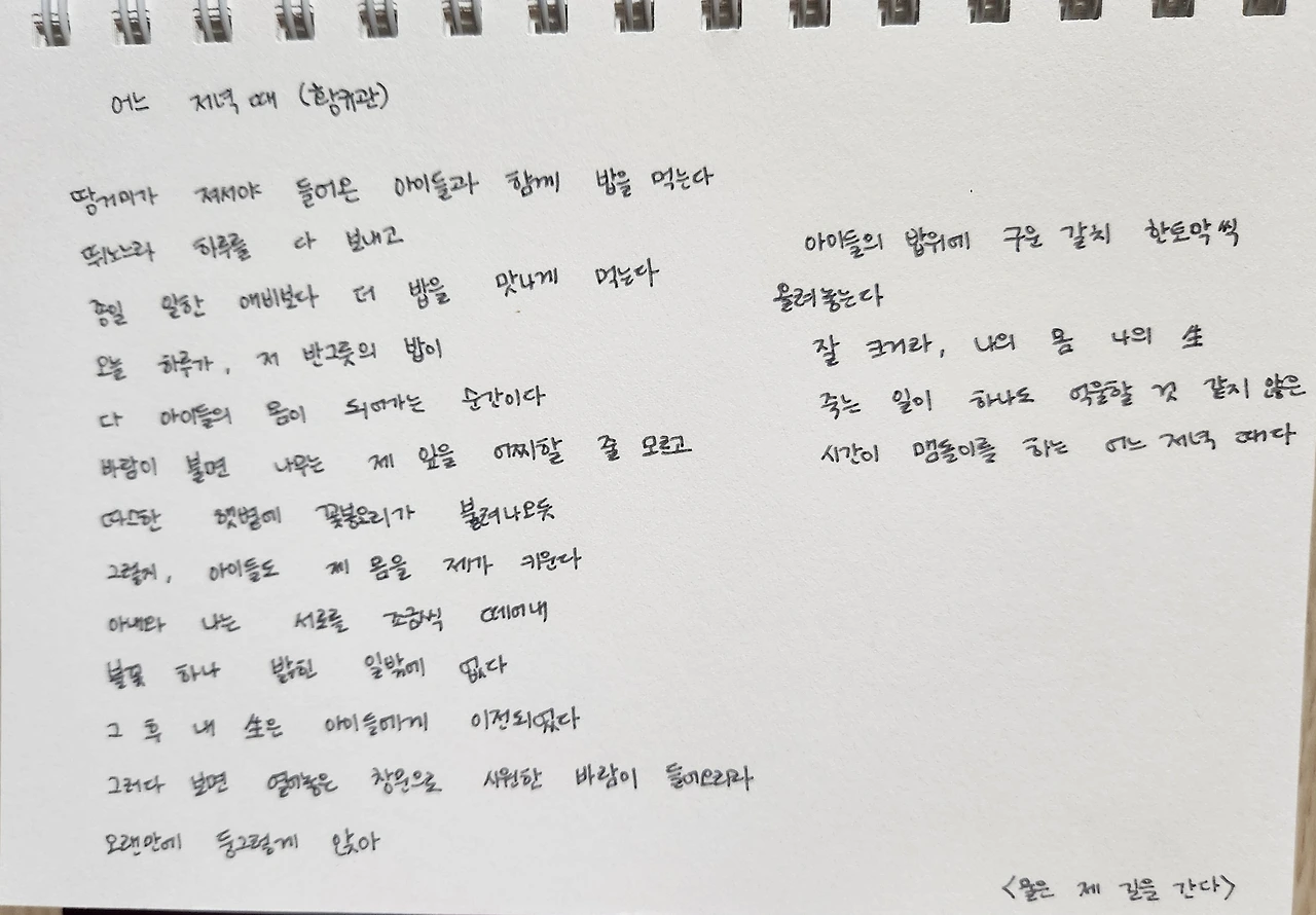 아이와 저녁을 먹으며 나눈 대화입니다. '죽는 일이 하나도 억울할 것 같지 않은/시간이 맴돌이를 하는' 저녁시간이었습니다. 친정엄마의 시간과 생을 양분 삼아 자란 저는, 이제 두 아이에게 생을 내어놓는 중입니다.