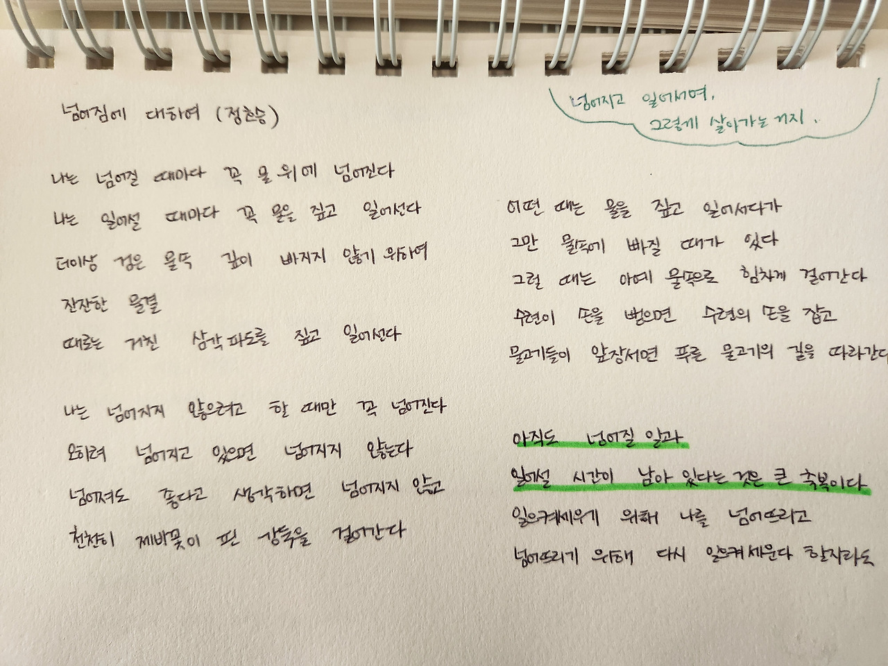 '아직도 넘어질 일과/ 일어설 시간이 남아 있다는 것은 큰 축복'이라고 합니다. 넘어질 일을 축복으로 받아들이기란 쉽지 않지만, 일어서 나아갈 것을 생각하면 축복이 분명합니다. 넘어져야 보이는 것들이, 넘어지는 순간에 배우는 것들이 반드시 있으니까요.