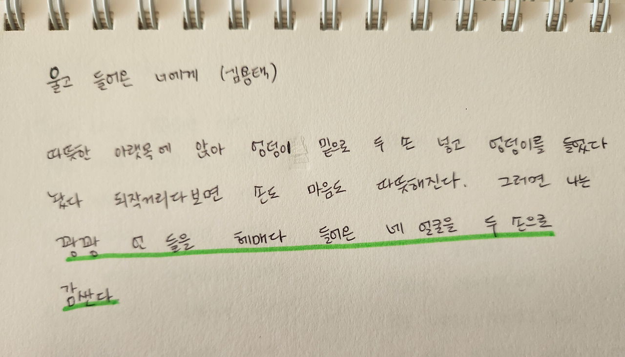 아이들에게 필요한 것은 그런 것이었나 봅니다. 대단한 조언이나, 현명한 충고보다는 따스한 품으로 받아주고 안아주는 것이요. ‘울고 들어온 너에게(김용택)’라는 시 덕분에, 오늘 하루 조금은 괜찮은 어른으로 아이들 곁에 있어줄 수 있었습니다. 품에 안겨 울던 네 아이의 밤이, 낮보다는 평안하기를 바라는 마음입니다.