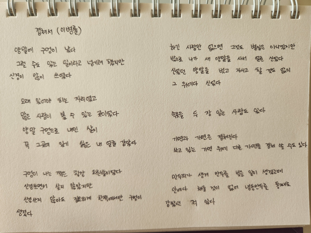 저는 다른 사람의 시선에 무척이나 민감한 사람입니다. 예의를 무척 중요하게 생각하고, 도덕적 기준 또한 무척 높아요. (스스로도 좀 피곤할 지경입니다.) 오늘의 시, ‘겹쳐서(이병률)’의 첫 행을 읽자마자 마치 제 양말에 구멍이 난 듯 등골이 서늘해졌습니다. '양말에 구멍이라니?!' 심지어 ‘오래 있어야 하는 자리’이자, ‘많은 사람이 볼 수 있는 곳’이라니요. 새 양말을 사서 구멍 난 양말을 ‘벗고 자시고 할 것도 없이’ 겹쳐 신는 모습에 너무 공감이 되어 헛웃음이 났습니다.