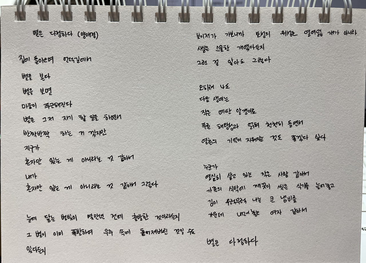 '별은 다정하다(양애경)'에서는 하늘에 반짝이는 별에서 다정함을 느낍니다. 철저히 혼자가 된 것 같은 밤, 칠흑 같은 어둠 속에서 반짝이는 별 하나. 마치 '너는 혼자가 아니야, 내가 여기서 너를 지켜주고 있어'라고 말하는 것 같아요. 어른이 된 우리는 사실, 다 알고 있습니다. 별의 진실을요. 하지만 그런 건 별로 중요하지 않아요. 그저 내가 혼자인 밤에, 내가 어둠 속에 갇힌 오늘밤에, 나와 눈 마주친 유일한 빛이 별이라면 이미 별은 특별한 존재가 됩니다. 마치 나를 기다리고 따스히 맞아주는 엄마의 품 같아요.