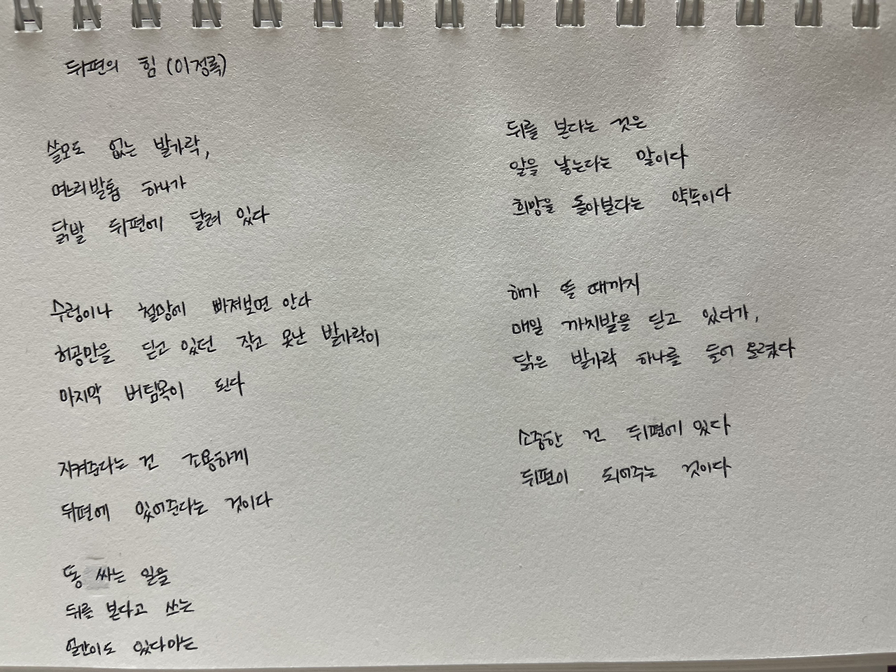 '뒤편의 힘(이정록)'은 아무 쓸모없어 보이는 닭발 뒤편의 며느리발톱에 주목합니다. '수렁이나 철망'에 빠지는 극한 상황이 되어 존재의 가치를 드러내는 며느리발톱. 그것은 닭발 '뒤편'에 있습니다. '지켜준다는 건 조용하게/뒤편에 있어준다는 것이다'라는 표현으로 며느리발톱의 가치는 더없이 소중한 것이 되어요.