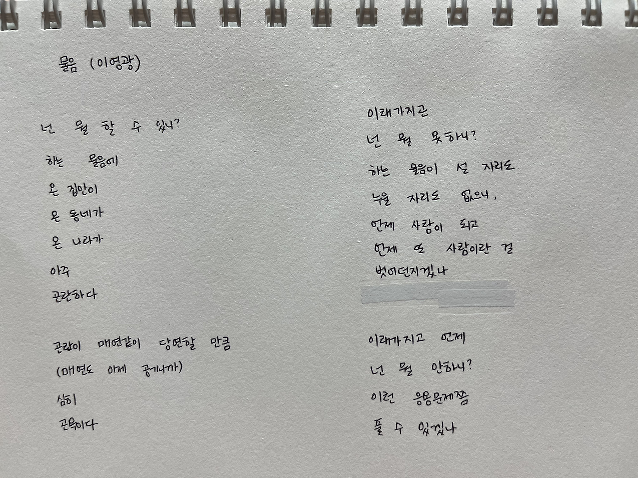 그래서였을까요. ‘물음(이영광)’에 단번에 마음이 뺏겼습니다. ’넌 뭘 할 줄 아니?‘라는 질문에 ‘온 집안이/ 온 동네가/ 온 나라가/심히/ 곤란하다‘고 하는 것을 보니, 비단 저만의 문제는 아니었던가 봐요. 대부분의 사람들이 그 질문 앞에는 속수무책으로 곤란함을 느끼고, 곤욕스러워한다니 어쩐지 위안마저 됩니다. 이러다가는 ‘넌 뭘 못 하니?’라는 물음이 설 자리가 없다고 해요. 돌이켜 보면 ‘넌 뭘 못 하니?’라는 질문은 받아본 기억이 별로 없어요. 누군가에게 ‘못 하는 것’을 묻는다는 것도 실례지만, 그 질문 앞에 선뜻 자신의 부족함을 고백할 사람도 별로 없을 것 같아요. 그러니, ‘넌 뭘 안 하니?’라는 응용문제는 당연히 풀 엄두도 낼 수 없지요.