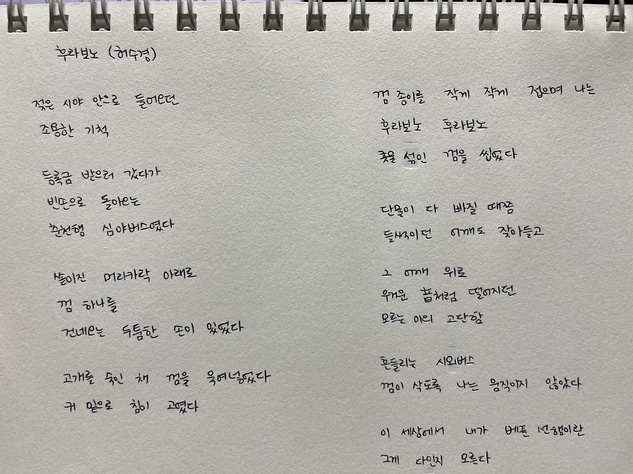 이번에는 화자의 어깨 위로 누군가의 고단함이 떨어져요. ‘무거운 음처럼’ 툭 떨어지는, 모르는 이의 머리를 이번에는 화자가 받아냅니다. 그의 단잠이 깰까 봐 입안의 껌도 씹지 않아요. 질기고 질긴 껌이 ’삭도록’ ’움직이지 않‘았다니, 아마 화자는 온 마음을 다해 그의 고단함을 받아냈을 겁니다. ’이 세상에 내가 베푼 선행이란/그게 다인지 모른다‘라지만, 이 시를 읽은 누구라도 그 선행이 사소하다 생각하지 않았을 겁니다.
