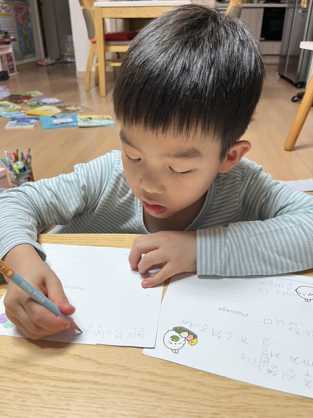 내일 졸업식을 위해 선생님들께 편지를 쓰기로 했다. 감성적인 면이 있지만 부끄러움도 많은 아이라 지금껏 선생님들께 편지를 쓰자고 했을 때 한 번도 그러자고 한 적이 없던 아이였다. 정말 마지막이라고 생각해서 그랬던 것인지 이번에는 제가 먼저 선생님께 편지를 쓰겠다고 했다. 그럼 엄마도 선생님께 편지를 쓰겠다고 하고는 저녁 시간 내내 함께 엽서를 색칠하고 편지를 썼다. 아이는 선생님 두 분께, 나는 졸업을 맞은 아이와 선생님 두 분께 마음을 담아 편지를 썼다. 둘째도 덩달아 어린이집 친구 한 명과 오빠에게 편지를 썼다. 이별을 준비하고 받아들이느라, 오랜만에 집안 전체가 고요한 시간을 보냈다.
