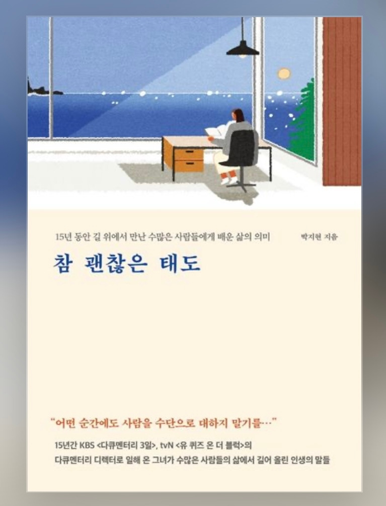 ‘참 괜찮은 태도(박지현)’는 ‘유 퀴즈 온 더 블록(이하 유 퀴즈)’과 ‘다큐 3일’이라는 프로그램의 디렉터가 쓴 책입니다. ‘유 퀴즈’와 ‘다큐 3일’은 모두 누군가의 인생을 다루는 프로그램이에요. ‘유 퀴즈’가 대화를 통해 누군가의 인생을 풀어낸다면, ‘다큐 3일’은 3일 동안 누군가의 인생을 영상으로 따라가며 보여줍니다. 두 프로그램의 디렉터였던 저자는 ‘참 괜찮은 태도’라는 책에서 프로그램 제작 과정에서 만났던 여러 인물의 살아 있는 인생 이야기를 들려줍니다.