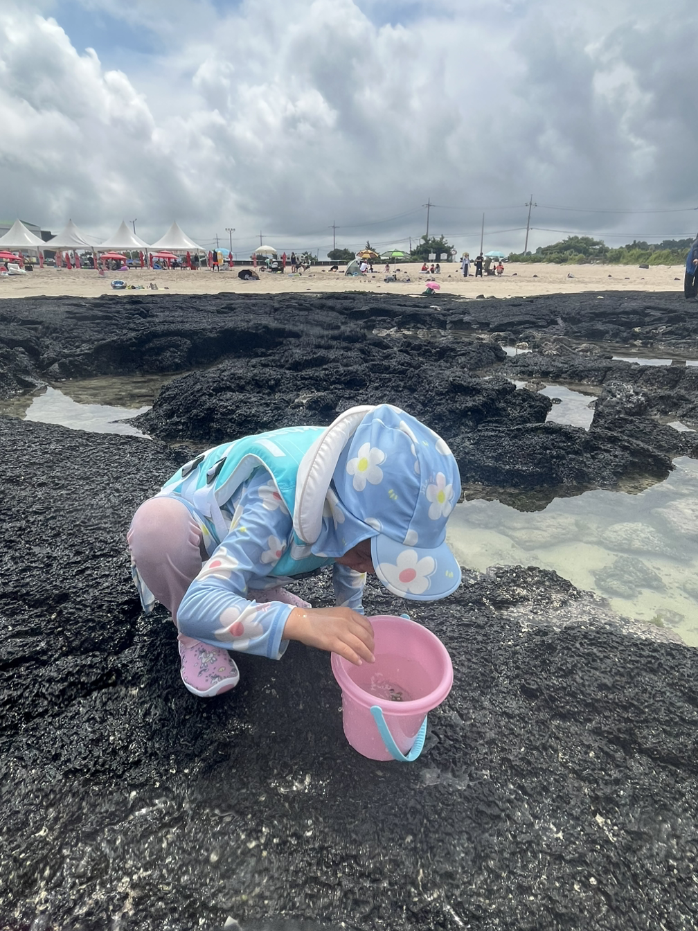 한 달 살기 둘째 날, 변덕스러운 제주 날씨를 제대로 경험했다. 아침을 먹고 아이들과 ‘오늘 뭐 하지?’ 이야기하다 또 바다 물놀이를 하기로 했다. 날씨를 검색해 보니 오후 1시경 비 예보가 있었다. 그때 시간이 오전 10시였으니, 두 시간 바짝 놀고 숙소로 돌아오면 되겠다고 생각했다. 들뜬 마음으로 아이들과 래시가드를 챙겨 입었다.