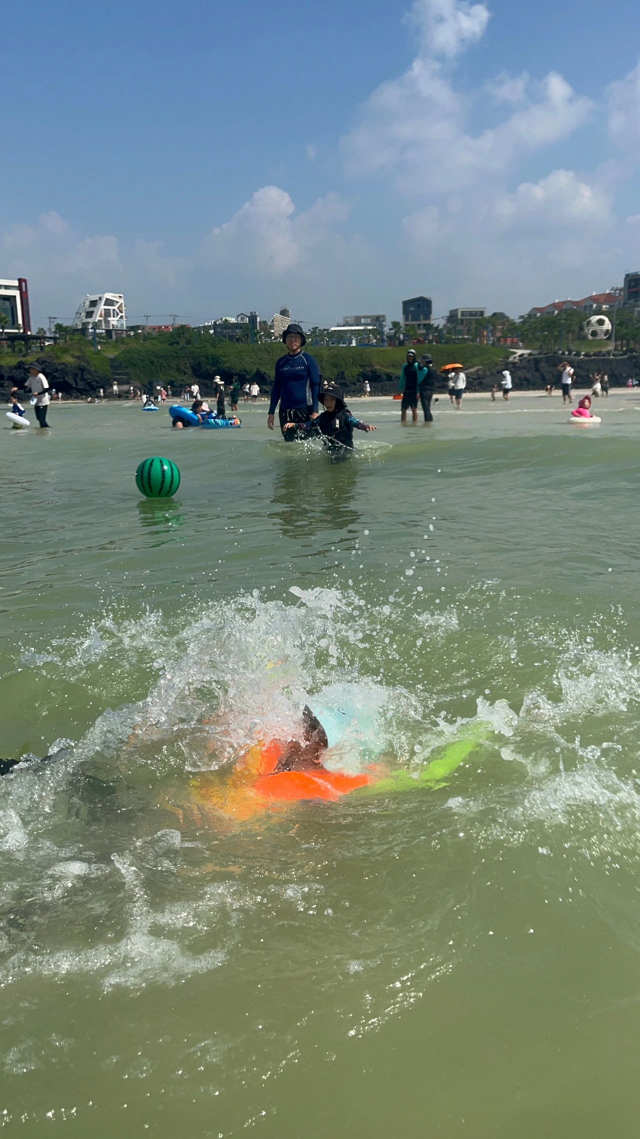 앞으로 3일 동안 물놀이를 못 한다니 첫째도 멈칫하더니 이내 그러자고 했다. 점심까지 든든하게 챙겨 먹고 오늘도 래시가드를 입었다. 물놀이 용품을 잔뜩 실은 카트를 끙끙거리며 싣고 바다로 달렸다. (쓰다 보니, 매일이 데자뷔 같다. 이거 어제도 쓴 것 같은데, 어제도 물놀이했는데, 그제도 한 것 같은데…..)