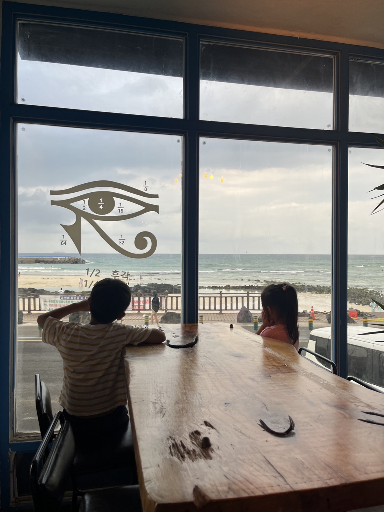 오후부터 하늘에 먹색 구름이 드리우기 시작하더니 이내 비가 흩날리기 시작했다. 비 오는 바다나 보러 갈까, 생각하자마자 바로 바다로 떠날 수 있다는 것, 이것도 여행의 묘미였다. 오늘은 어느 바다로 가볼까 하다 월정리 바다가 떠올랐다. 아이들에게 오늘은 엄마가 가고 싶은 바닷가 카페에 가자고 했다. 싫다고 할 줄 알았는데 어쩐 일인지 좋다고 말하는 아이들 덕에 기분이 더 좋아졌다. 우리는 각자 읽고 싶은 책을 한 권씩 챙기고, 아이들은 그림을 그릴 수첩도 챙겼다.