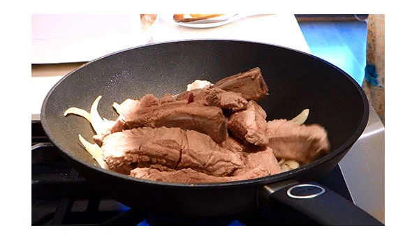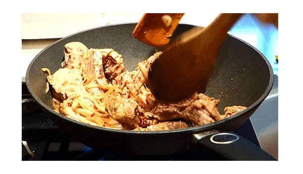 12. 소스를 추가한 뒤, 고기에 고루 베도록 다시 볶아 주세요.
