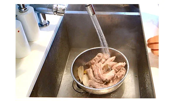 5. 데쳐낸 돼지갈비를 망에 넣고 찬물로 샤워를 해줍니다. 이렇게 갈비를 차게 식혀줌으로서 필요 이상으로 갈비가 익거나, 뼈에서 피가 흘러 나오는 것을 막아 줄 수 있어요.