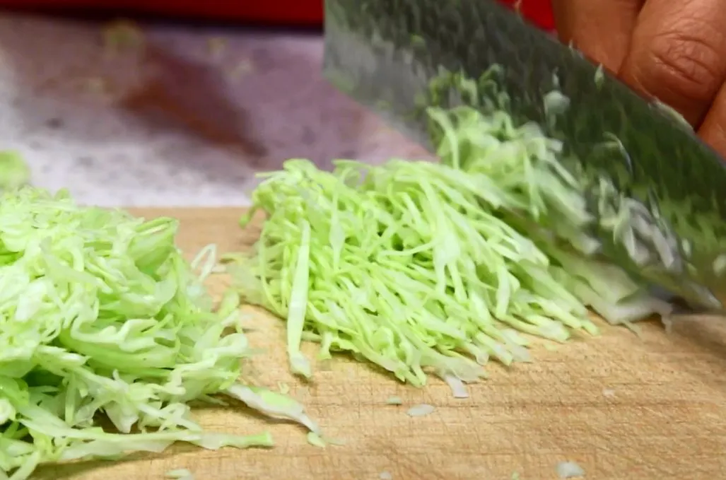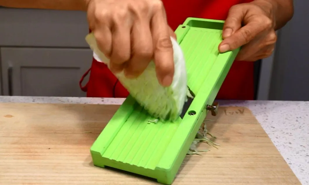4. 양배추를 썰어주세요. 속 잎은 채칼로, 부드러운 겉 잎은 손으로.