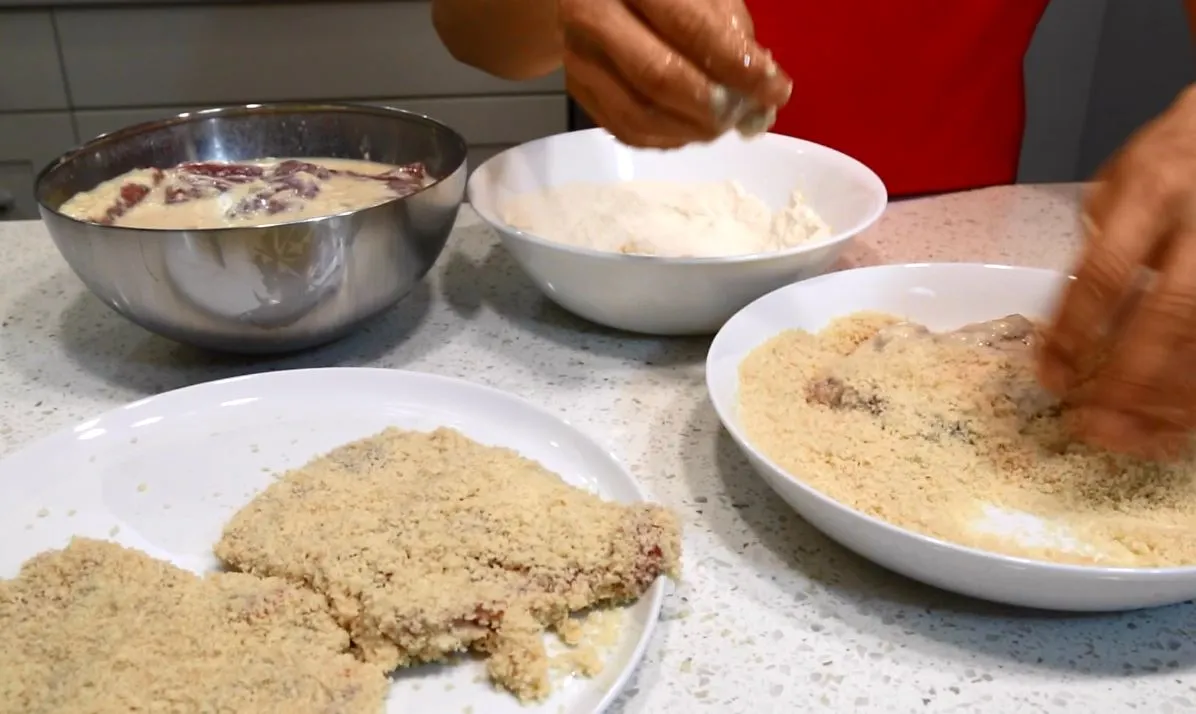6. 우유와 양념이 섞인 국물에 잠긴 고기를 꺼내서 튀김가루 —> 우유 국물 —>빵가루 순으로 묻힙니다. 결과적으로 우유 국물이 두 번 묻는 것이어요. 저 국물에 달걀은 물론, 사과즙과 양념이 다 들어가 있기 때문에 별도의 달걀물은 필요하지 않습니다.