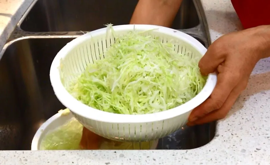 5. 썰은 양배추는 물에 살짝 헹군 뒤 물기를 빼서, 비닐봉지에 넣어 냉장 보관하세요. 양배추의 아삭 거리는 식감을 위해서 이리 하는 겁니다.