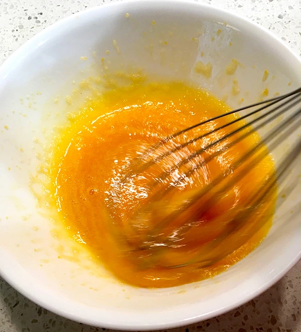 2. 알끈을 제거하고 달걀을 풀어준다. 부풀리는 케이크가 아니므로 너무 심하게 달걀 거품이 나지 않도록 한다.