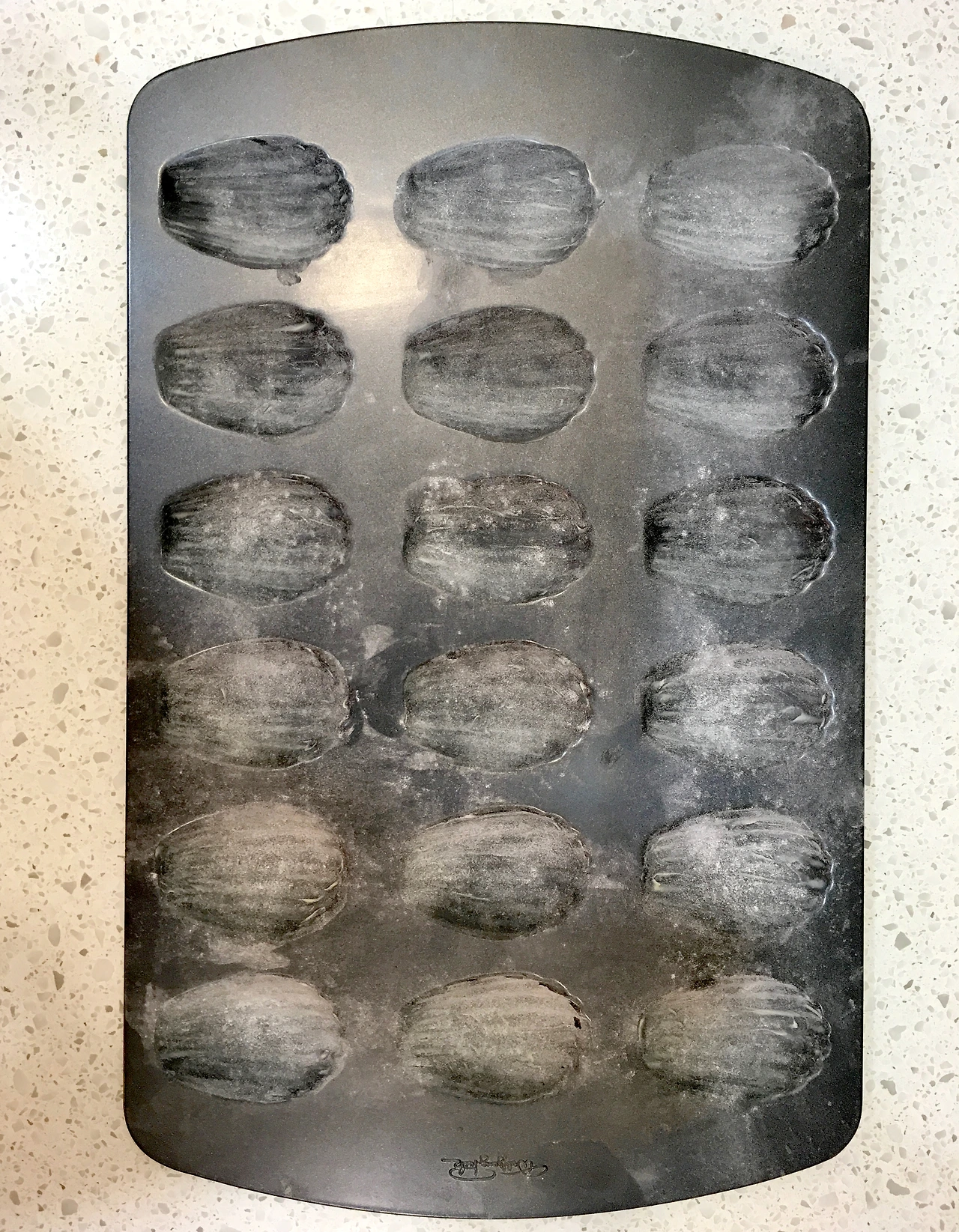 7. 마들렌 틀에 버터를 바르고, 밀가루를 뿌린다.