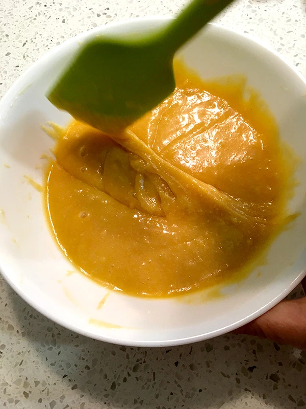 3. 버터를 살짝 데워서 설탕, 바닐라 에센스, 꿀과 섞는다.