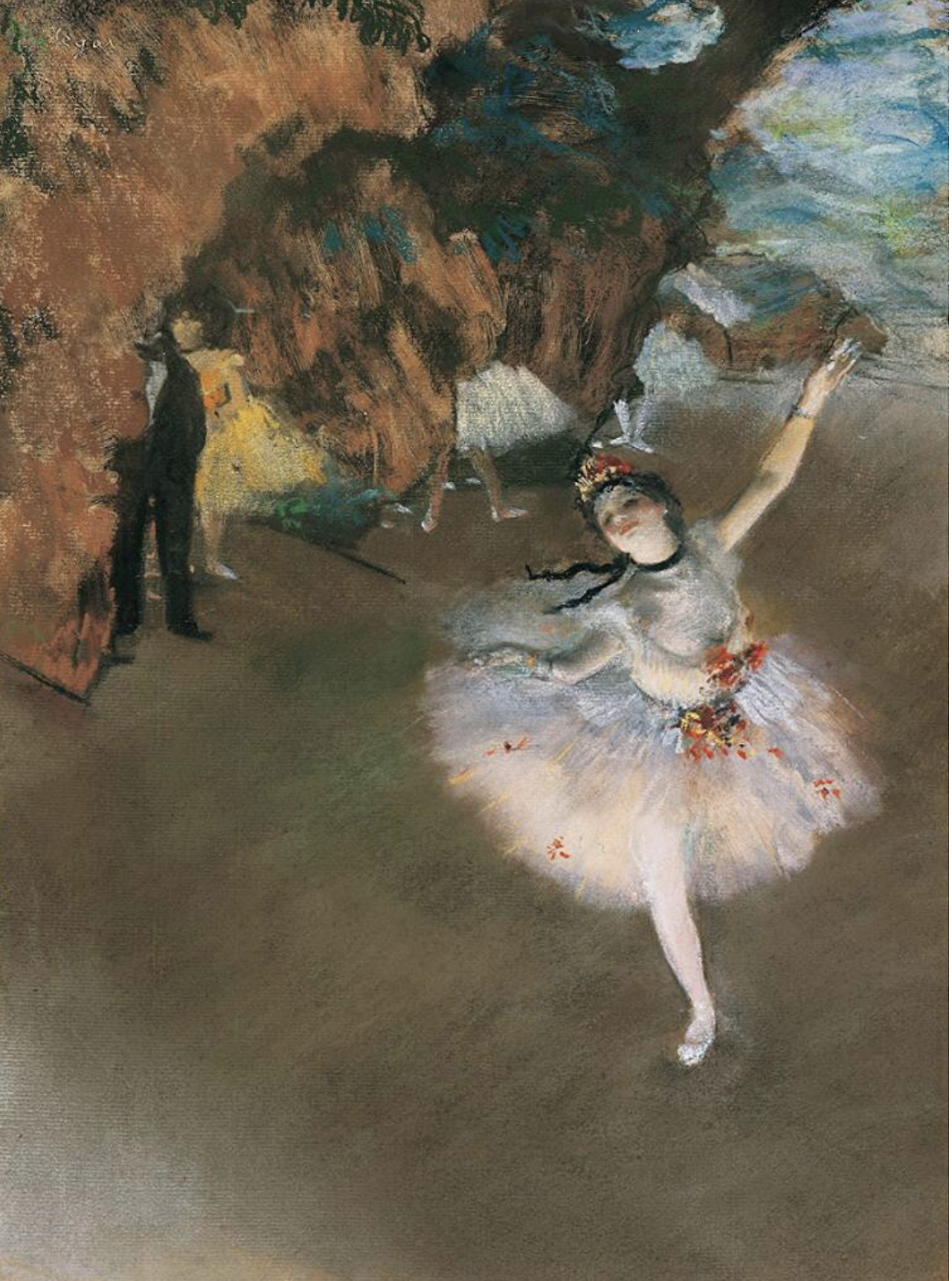 <발레 리허설>의 경우, 스폰서로 추정되는 남자가 우측에 있습니다. 그의 모습은 어둡게 채색돼서 마치 어린 발레리나들을 덮쳐버릴 마왕처럼 보이기도 합니다. 바로 아래 그림인 <스타>에는 발레리나 뒤로 검은 연미복을 입은 스폰서의 얼굴이 가려져 있어서, 약간 섬뜩한 느낌이 들기도 합니다. 얼굴은 안 보이지만 그의 자세를 보건대, 시선은 분명 무대 위의 발레리나를 바라보고 있네요. 그리고 제 추측으로는 박스석에 또 다른 잠재적 스폰서가 있는 것 같습니다. 그림의 시선은 발레리나를 위에서 아래로 내려다보고 있거든요. 현재와 달리 과거엔 2층이 비싼 자리였고, 박스석은 왕이나 귀족들이 앉던 자리였습니다. 그러니까 <스타>에서는 그림 속, 그리고 그림 밖 모두에 탐욕스러운 시선들이 존재하고 있는 것이지요. 마지막으로, <무대 위의 리허설>에는 오만한 자세로 자신들의 쾌락을 채울 상대를 물색하는 스폰서들의 모습이 보입니다. 발레리나들은 열심히 공연 준비를 하고 있지만, 오른쪽의 남자들은 공연에는 전혀 관심이 없는 듯합니다. 빨리 리허설이 끝나기를 기다리는 듯한 지루한 모습이죠.