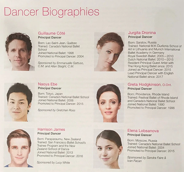 대부분의 예술이 다 그렇겠지만, 특히 스폰서 없는 발레는 상상할 수 없습니다. 대중적이지 않은 분야이기 때문에 공연 수익만으로는 발레단 운영이 힘들기 때문입니다. 그래서 저는 발레 공연을 볼 때마다 후원 기업들을 체크해 보는 오지랖을 떨곤 하는데, 최근 캐나다 국립발레의 팸플릿에서 특이한 형태의 스폰서십을 발견했습니다. 발레 팸플릿에 적혀있는 스폰서는 발레단을 지원하는 것이 일반적인데, 특정 무용수들을 후원하는 이름들이 적혀있는 겁니다. 저는 예술인도 운동선수처럼 개인적인 지원을 받으면 좋겠다는 생각을 늘 해왔기 때문에, 팸플릿에 적힌 이름들을 보니 고맙고도 반갑더군요.
