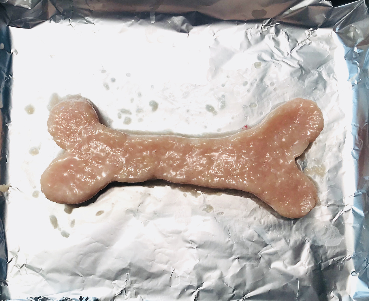 2. 고기로 뼈다귀 모양을 만드세요. 손에 오일을 묻혀가며 하면 더 쉽게 됩니다. 약간 과장되게 모양을 잡아야 구웠을 때 형태가 잘 나옵니다.