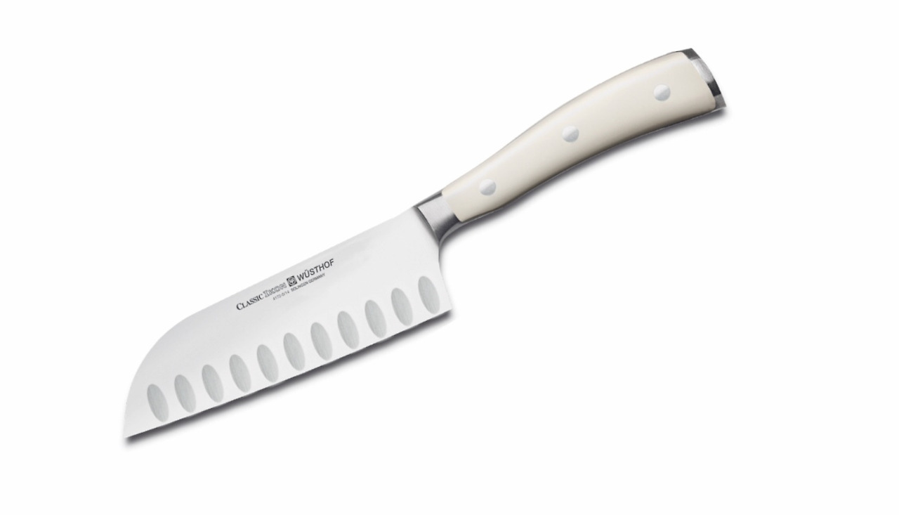 산도쿠 나이프는 한자어로 삼덕, 즉 세 가지 좋은 점을 의미하는데, 이는 다지기, 얇게 썰기 그리고 깍둑썰기를 의미합니다. 즉, 채소 써는 데에 최적화된 칼입니다만, 다목적용 칼로 사용할 수도 있어요. 그러나 칼날이 예민하므로 뼈 있는 고기나 언 고기에는 사용 금물입니다. 사실 고기에는 전용 칼을 따로 사용하는 것이 좋아요. 산도쿠는 칼 두께가 얇아서 저미거나 채 칠 때는 더할 나위 없이 좋지만, 힘을 많이 받지 못합니다. 고기 써는 칼은 두께 감이 있어야 편하게 썰리고, 아무래도 칼 끝이 뾰족해야 손질할 때 편하겠지요.