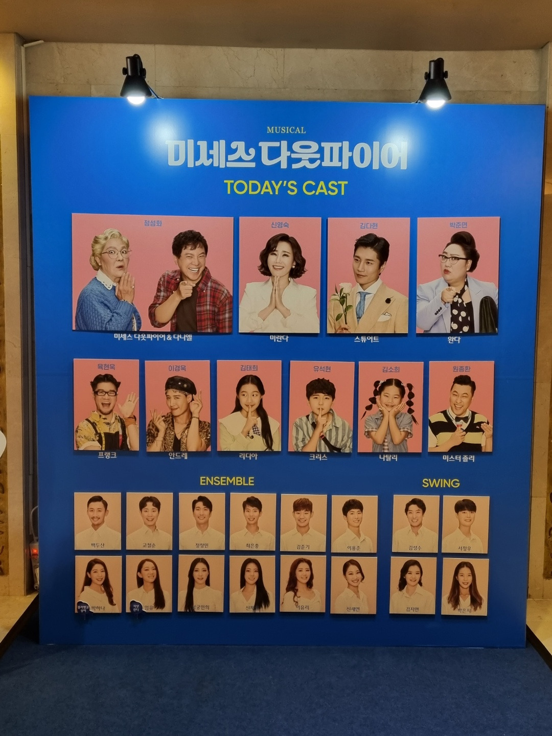 여하 간에 명절임에도 불구하고 극장을 찾은 관객은 여느 때와 다름없이 가득했다. 미세스 다웃파이어 작품 자체가 가족 뮤지컬이라는 장르 특성도 있겠으나 "명절"에 가족이 함께 뮤지컬 관람을 하는 모습이 심심찮게 보여 예전과는 좀 다르구나 싶었다.
