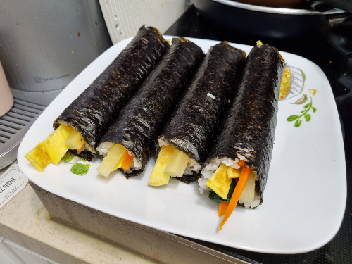 뭐니 뭐니 해도 도시락엔 김밥 아니던가. 돌이켜보면 나는 상당히 오래전부터 집에서 김밥을 직접 싸 보기 시작했는데, 김밥 체인점들이 우후죽순 생겨나고 마음만 먹으면 어디서나 김밥을 사 먹을 수 있는 요즘과는 달리 예전에는 김밥이 당기면 하루 날을 잡아 집에서 판을 벌려야 했다. 더구나 해외에서 오래 생활했던 내게는 김밥이 그리운 날엔 반드시 내 손으로 수고로움을 마지않아야만 했다. 그렇게 쌓인 실력이다 보니 내가 만든 김밥은 누구에게나 반응이 괜찮다. 사실 그 안에 무엇을 넣고 만든다한들 중간은 가는 음식이 아니던가.