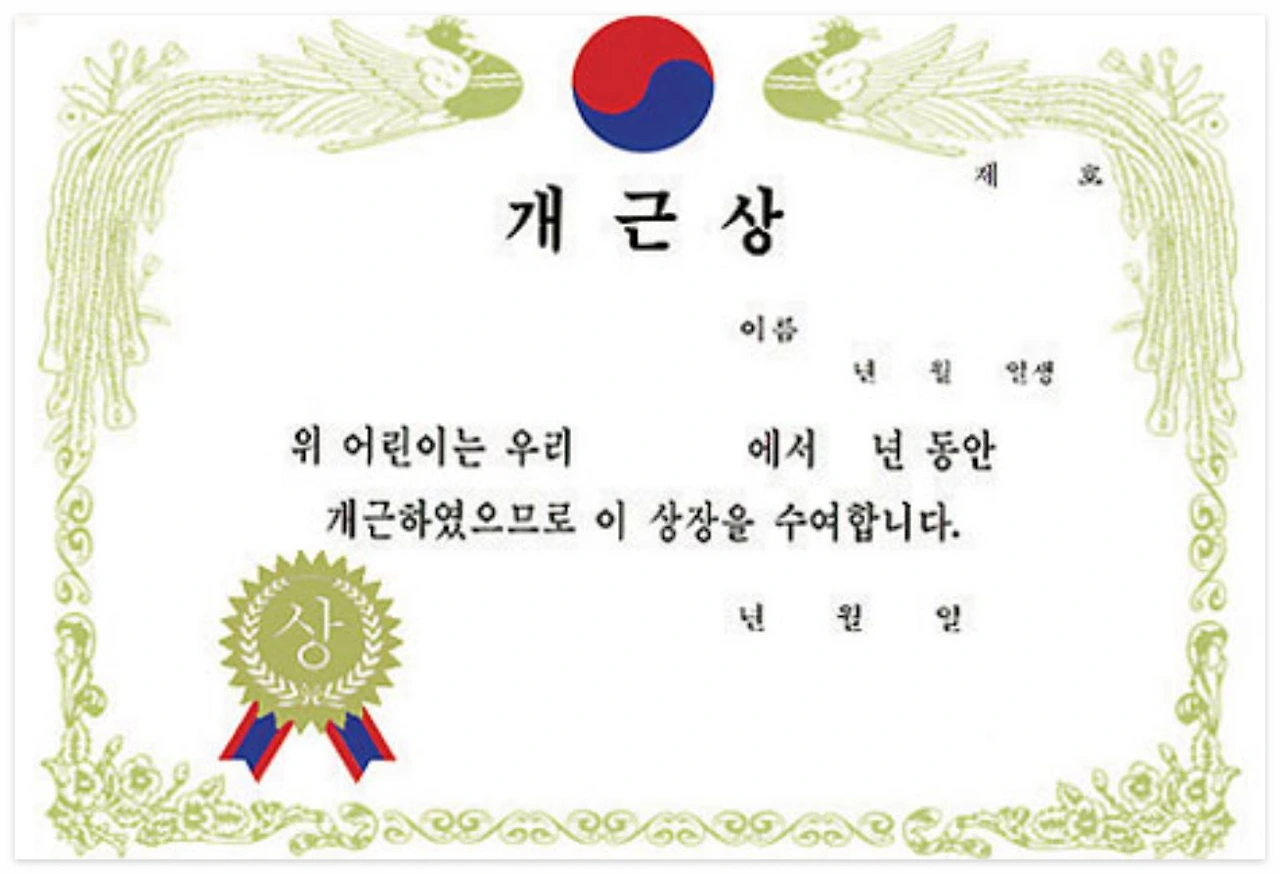 내 어릴 적 국민학교 시절에는 '개근상'은 정말 훈장과도 같았다. 국민학교 6년의 시절을 통틀어 단 한 번도 학교에 빠지지 않았다는 건 요즘 대세로 부각된 '끈기'라는 키워드 측면에서 그야말로 아니 대단할 수 없는 일인 것이다. 내 기억에 나는 6년의 세월 중 안타깝게도 단 하루를 결석하여 개근상의 영광을 놓쳤는데, 모르긴 몰라도 그 빠졌던 날엔 아프긴 상당히 많이 아팠던 모양이다. 학교에 안 갈 정도였다니...