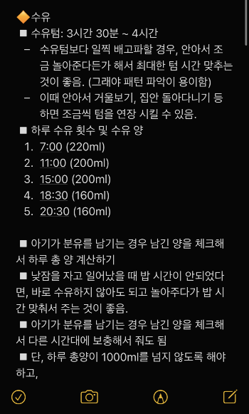 돌 이전 아기의 성장은 정말 빠르기 때문에 분유 먹는 횟수, 1회 분유량, 이유식, 낮잠 횟수, 낮잠 시간대가 계속 변한다. 그러므로 매뉴얼도 잦은 업데이트가 필요하다. 두 분께 아기를 맡기기 전에 급하게 현재 월령에 맞는 매뉴얼을 작성했다. 그리고 프린트를 하여 냉장고 앞에 붙여두었다.