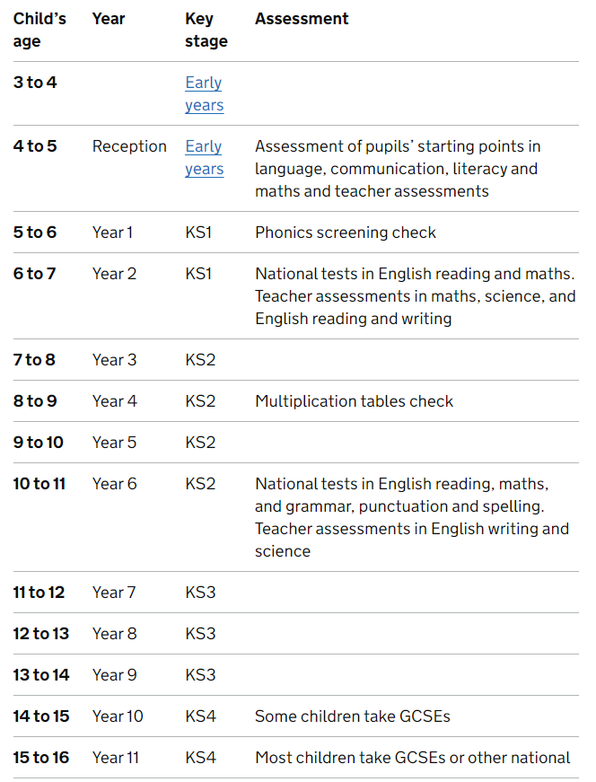 영국 공립학교(영국에선 공립학교를 Public school이 아니라 State school이라고 부른다.)는 국가 교육과정(National curriculum)을 따른다. 국가 교육과정에 의하면 18세까지의 교육과정을 단계별 교육과정(Key Stage, KS)이라는 그룹으로 묶어놓았다. 각각의 단계가 끝날 무렵에 아이의 현재 레벨을 평가할 수 있는 시험을 본다.