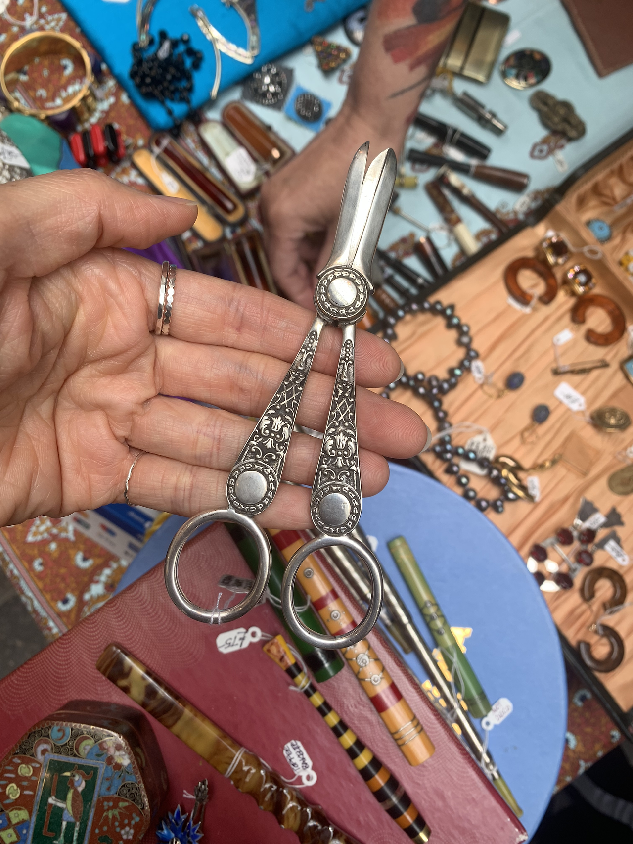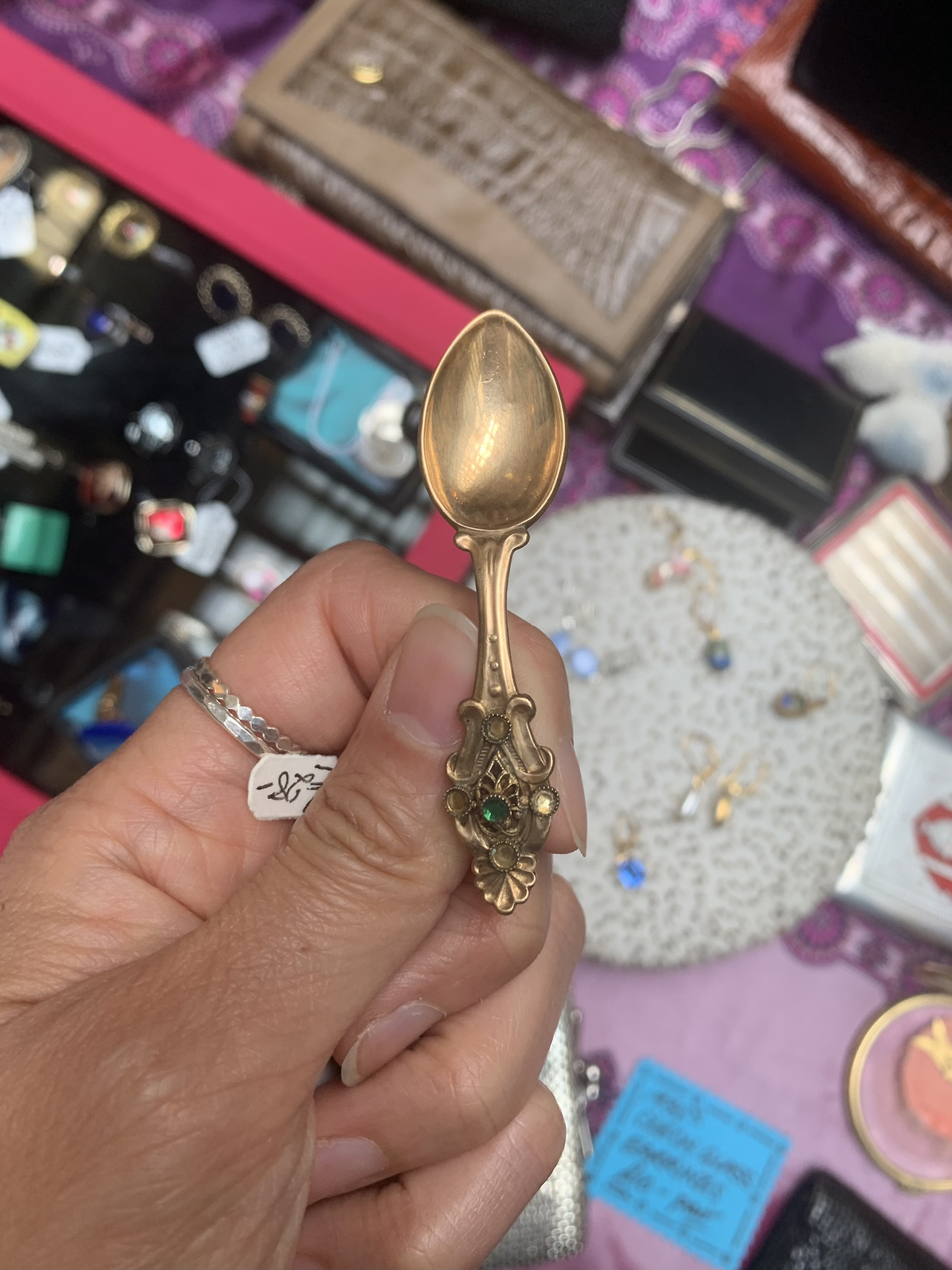 무질서하게 진열되어 있는 빈티지 물건 중 신기하게 눈 속 조리개를 순식간에 열리게 하는 물건들이 있다. 평소 스타일과 다르게 오밀조밀 세밀하게 세공된 티스푼 브로치와 체코산 하얀 유리 귀걸이가 보였고 망설임 없이 집어 들었다.