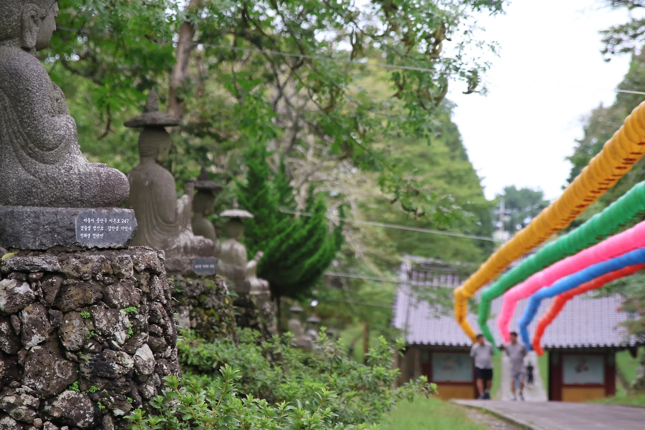 제주를 대표하는 사찰 관음사는 한라산 북쪽 기슭에 위치하고 있어요. 고려 때 창건된 것으로 전해지는데 일제감정기와 한국전쟁을 거치며 꽤 힘든 시기를 겪은 곳입니다. 무엇보다 여기는 길게 뻗은 돌길 양쪽으로 줄지어 서 있는 작은 불상들이 인상적인 곳인데요. 더불어서 알록달록한 등들이 마치 길을 안내하는 것처럼 천왕문에서부터 길게 늘어서 있습니다. 이 길에서는 누구라도 카메라를 꺼내들지 않을수가 없어요