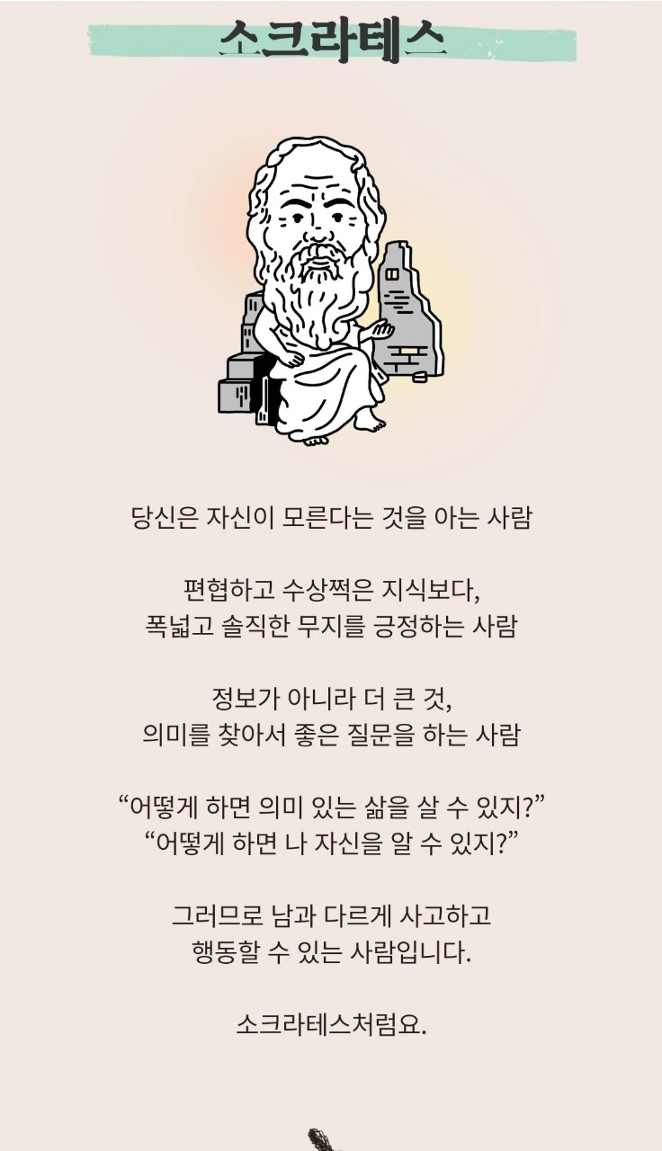 (p.44) "그 사람보다는 내가 더 지혜롭다. 왜냐하면 우리 둘 다 아름답고 훌륭한 것을 전혀 알지 못하는 것 같은데, 이 사람은 어떤 것을 알지 못하면서도 안다고 생각하는 반면에 나는 내가 실제로 알지 못하니까 바로 그렇게 알지 못한다고 생각도 하기 때문이다. 어쨌든 나는 적어도 이 사람보다는 바로 이 점에서 조금은 더 지혜로운 것 같다. 나는 내가 알지 못하는 것들을 알지 못한다고 생각도 한다는 점에서 말이다. "