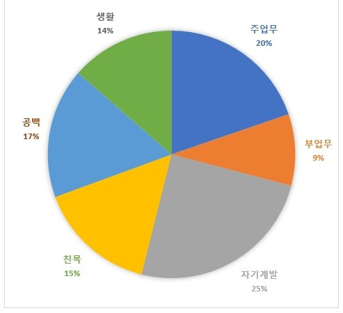 내 [주업무]가 가사/돌봄 노동이란 걸 인정하는 것도 두 달이 걸렸다. ‘주 업무’, ‘부 업무’에서 주는 어감은 굉장히 비즈니스적이다. 더군다나 나의 시간 통계가 모임 원들에게 공개되기에 나는 주업무를 유급노동으로 분류하고 싶었다. 적은 소득이지만 프리랜서로 하고 있는 일이 주 업무고 가사 돌봄은 무급이기에 부업무라고 분류하는 게 그럴듯해 보였기 때문이다. 전형적인 자기부정이자 자본주의에 입각한 사고방식이었다.