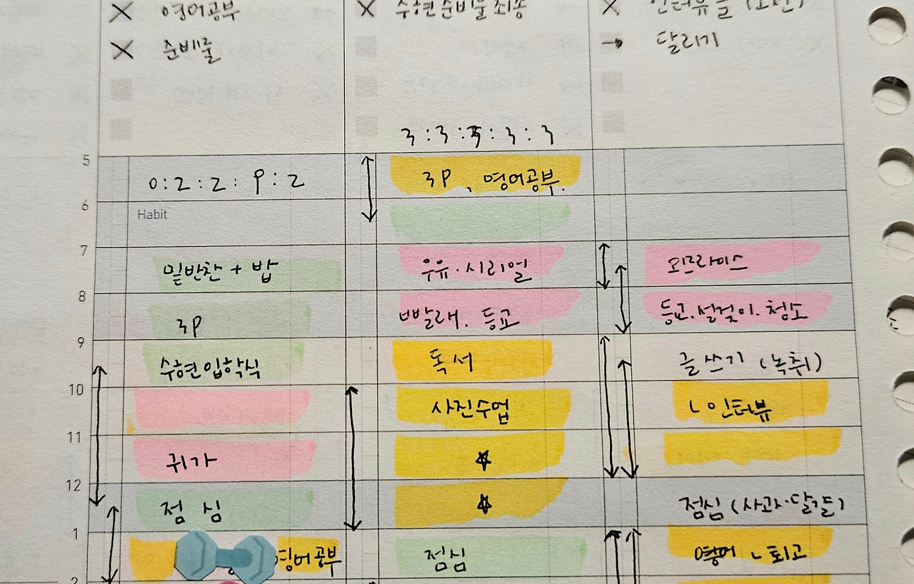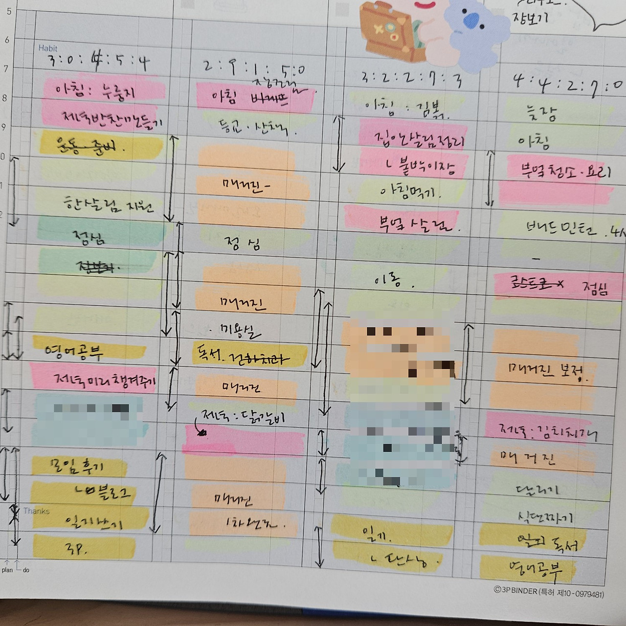 <3P 바인더> 회사의 다이어리를 쓰고 있는 동료에게서 배운 다이어리는 조금 특이했다. 자신의 활동을 다섯 가지로 분류하고 그 시간을 형광펜으로 칠하면 내 활동이 어디에 치중되어 있는지 색상점유율이 그것을 말해준다고 했다.
