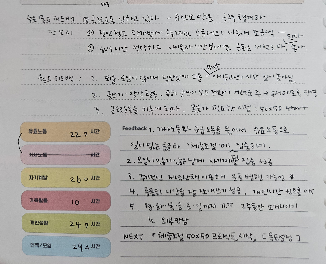 피드백타임은 타인의 다이어리를 피드백해 주는 게 아니라 스스로 내 것만 하면 되었다. 각자 고유한 일상과 목표가 있고 욕구와 상황이 다르므로 우리가 공유하는 것은 회고하는 시간을 가졌다는 것 그 자체이다.