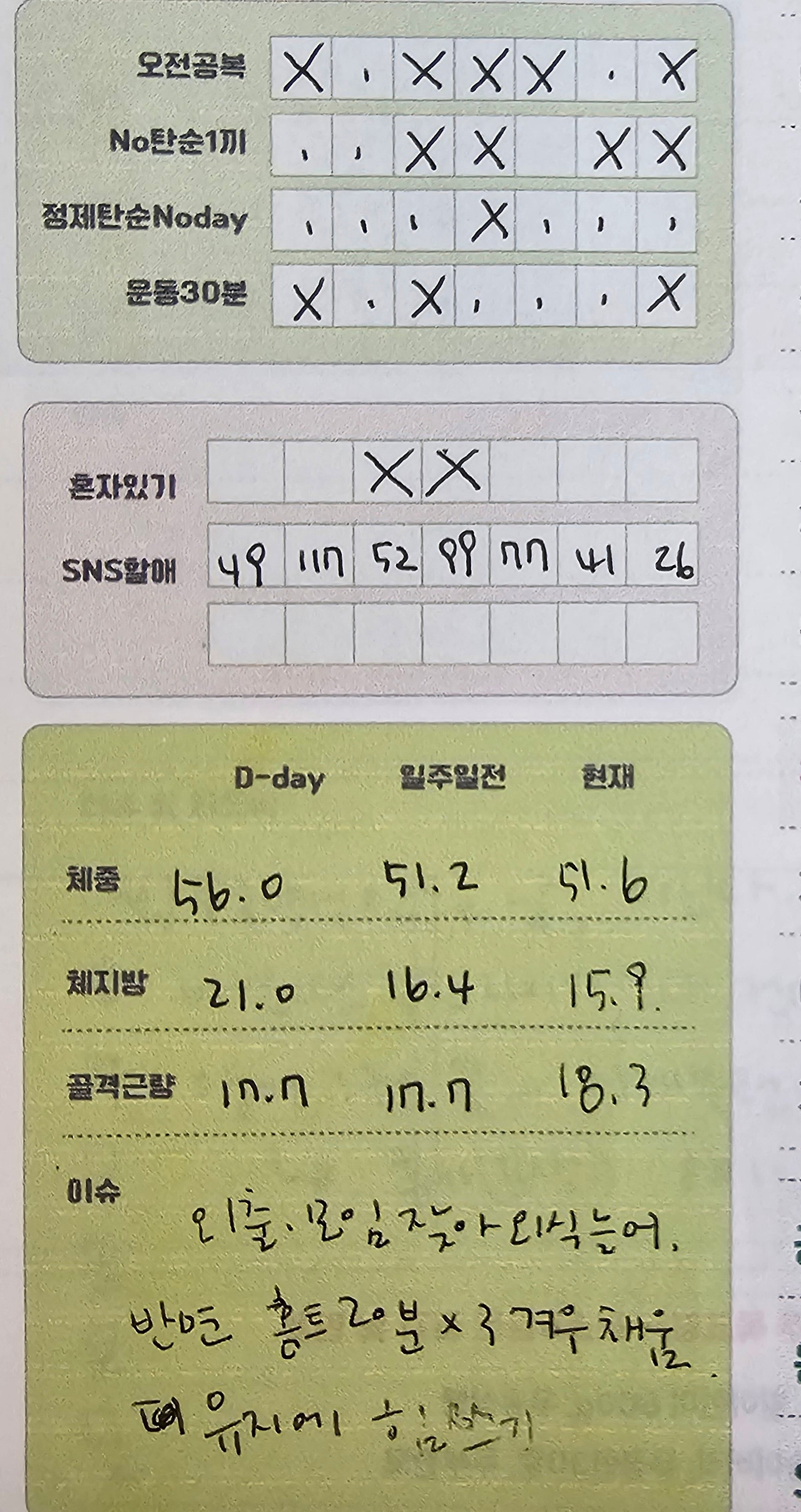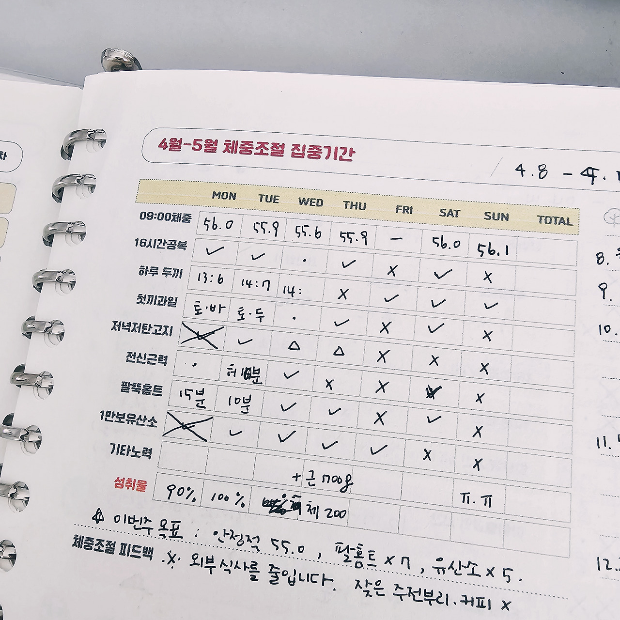 나는 지난해 4월 다이어리를 활용해 일상에 다이어트 계획을 끼워 넣었고 8월에 50kg이 되었다. 지금은 그 체중을 간신히 유지하고 있다.ㅎ 식습관은 역시 쉽게 고쳐지지 않는다.