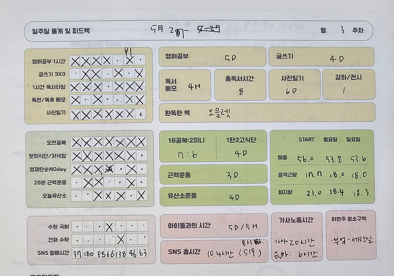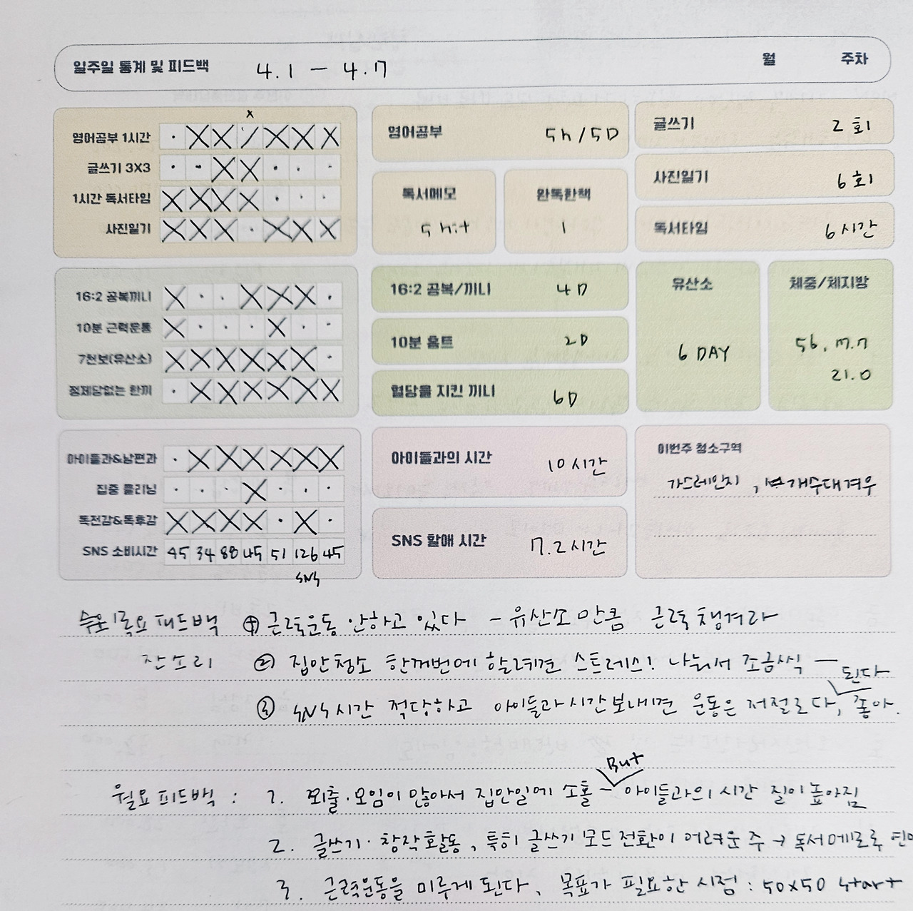 실행 가능하도록 다이어리를 활용하고 내 실행이 그 칸을 채우는 행동으로 일주일을 모아보면 다음 행위에 동기를 부여하는 힘이 뇌에 생긴다. 요즘 루틴박스나 습관체크 달력이 잘 팔리는 이유다.