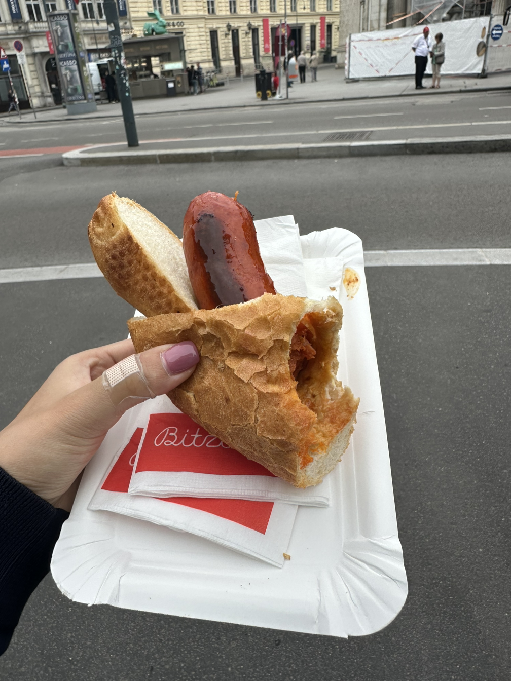 숙소에서 아무것도 먹지 않고 나왔던 터라 다들 배가 고프다고 했다. 합스부르크 궁전 정원에 있는 출구로 나오니 마침 멀지 않은 곳에 핫도그 스탠드가 있었다. 빈에 왔으면 비엔나 소시지는 먹어 봐야지. 다들 핫도그 하나씩 사들고 가게 앞에 있는 광장 벤치에 앉아 허기를 달래었다.
