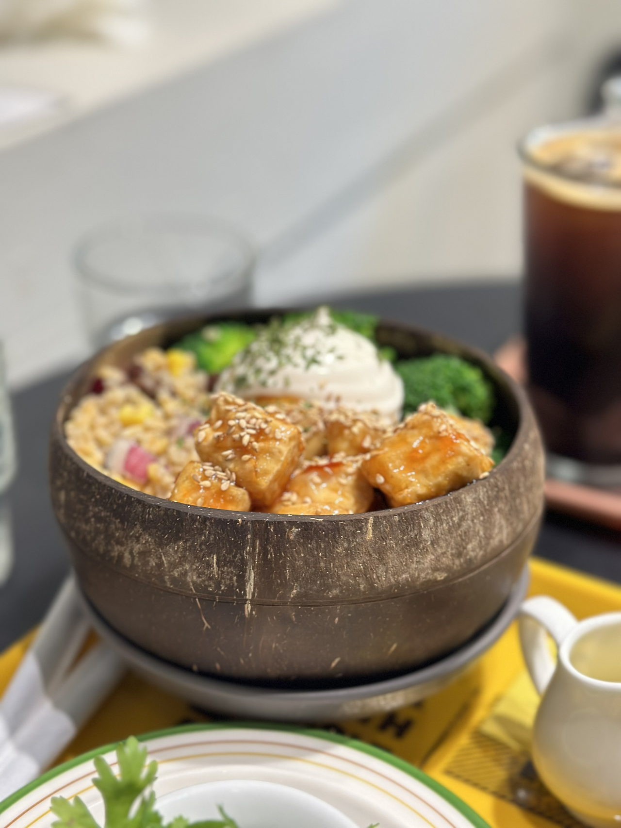 두부 강정볼은 브로콜리와 퀴노아 샐러드, 구운 두부, 소이 마요, 라임 비네갈이 들어갔는데 채소와 두부가 가득 있어서 인지 둘이서 나눠 먹었는데도 배가 많이 불렀다. 여기 들어 있는 두부의 식감은 참 신기했는데, 우리가 평소에 먹는 잘 으깨지고 포슬포슬한 두부가 아니라 치즈처럼 매끈하고 단단하면서도 씹을 때 결이 느껴지는 그런 두부였다. 치즈를 사랑하는 나로서는 그 맛이 좋고 재밌어서 계속 두부를 조금씩 베어 물어 속을 구경하고 씹으면서 그 탱글한 식감을 즐겼다.