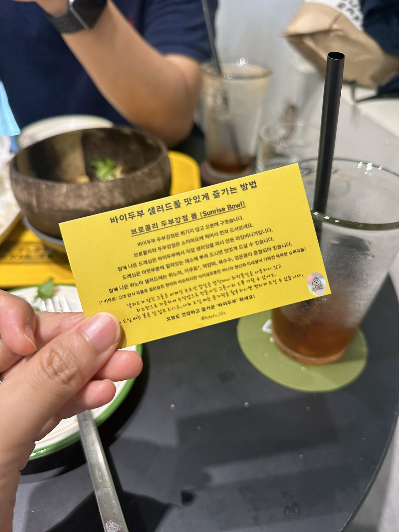 언덕 맨 꼭대기에 위치한 <바이두부>. 위치는 극악이지만 맛은 최상입니다. 외국인들도 많이 찾고, 반려동물도 함께 갈 수 있는 자유로운 분위기의 식당이에요. 주문해서 맛본 음식 모두 맛있었는데요. 저는 특히 두부 반찬이 연상되었던 바이두부 랩이 가장 맛있었습니다. 두부에서 느껴지는 진한 양념 맛이 좋았달까요? 세 음식 모두 남녀노소 선호할 만한 맛이었어요. 부모님과 함께 가더라도 절대 '집밥이 낫다'는 말은 안 할 것 같은, 건강함과 맛 모두를 챙길 수 있는 곳이라고 느꼈습니다. (저희 부모님은 외식을 할 때면 항상 '집밥이 낫다'라고 하시거든요.) 채식을 즐기지 않는 분에게도 추천하고 싶은 곳이에요. 단점이라면 공간이 좁은데 테이블 간격도 좁아서 이동하기에 불편하다는 점인 것 같아요. 물이나 식기류, 음식 픽업 등을 모두 셀프로 진행해야 해서 여러 번 자리에 일어나 이동해야 하는데, 혹여나 다른 사람과 부딪힐까, 다른 테이블의 음식을 실수로 건들지는 않을까 걱정했거든요. 이런 작은 단점은 맛으로 충분히 보상이 가능합니다. 다음번에도 꼭 다시 방문하고 싶은 곳이에요.
