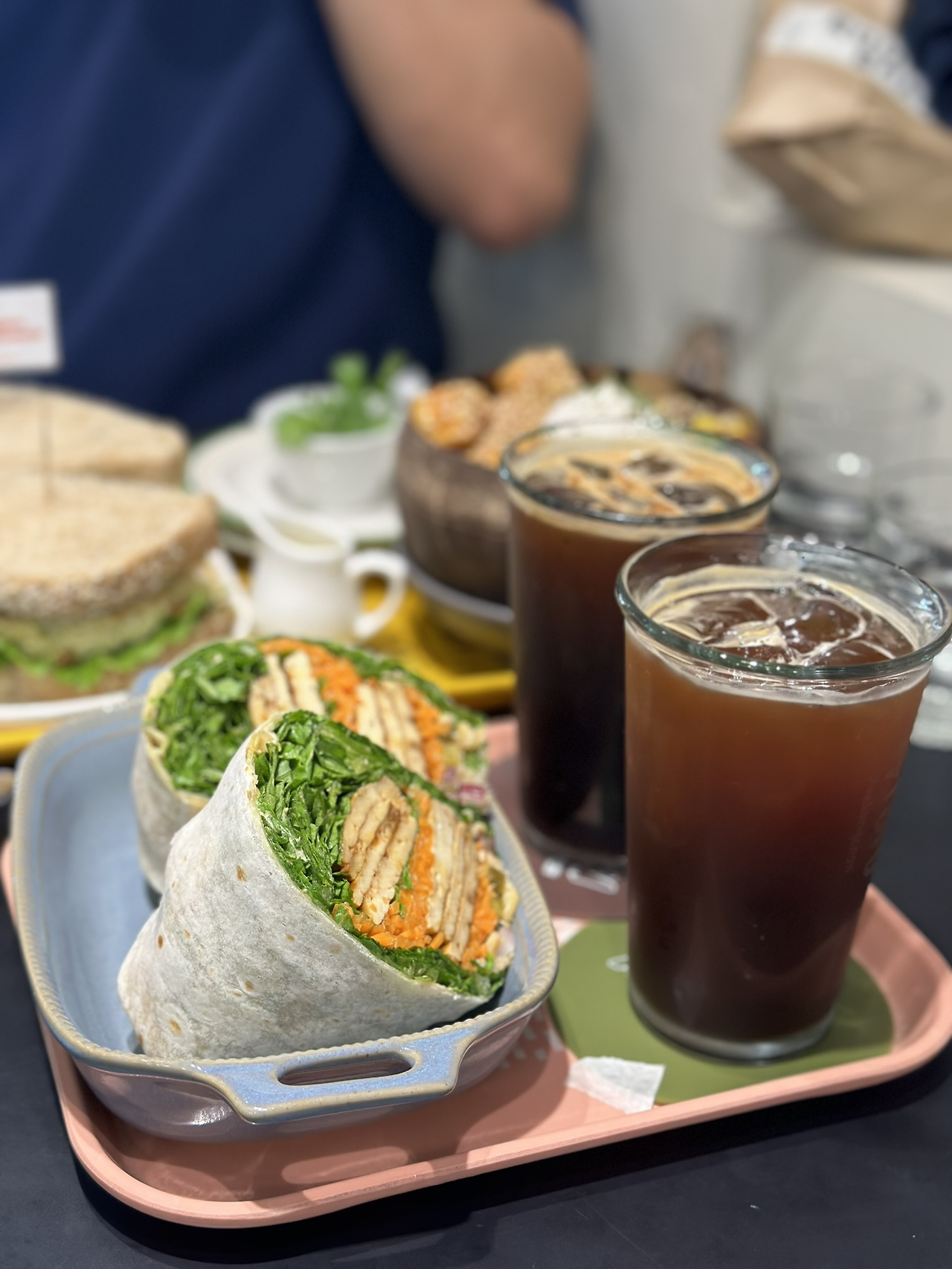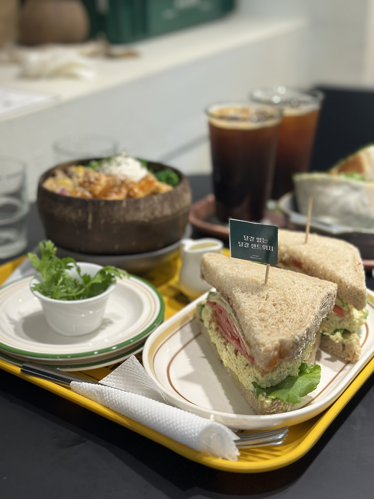 예상치 못한 등산에 힘이 들어 에너지가 필요해서였는지, 아니면 이런 위치라면 다시 못 올 것 같다는 성급한 판단 때문이었는지 모르겠지만 (어쩌면 둘 다였을지도) 나와 박군은 평소보다 메뉴를 좀 더 시켰다. 바이두부 랩, 브로콜리 두부강정볼, 그리고 달걀 없는 달걀 샌드위치 이렇게 세 가지 음식을 주문했다. 아, 우리는 커피가 필요했다. 아이스 아메리카노 두 잔을 주문했다. 물론 나는 디카페인으로. (몇 년째 디카페인 커피 위주로 마시고 있다.)