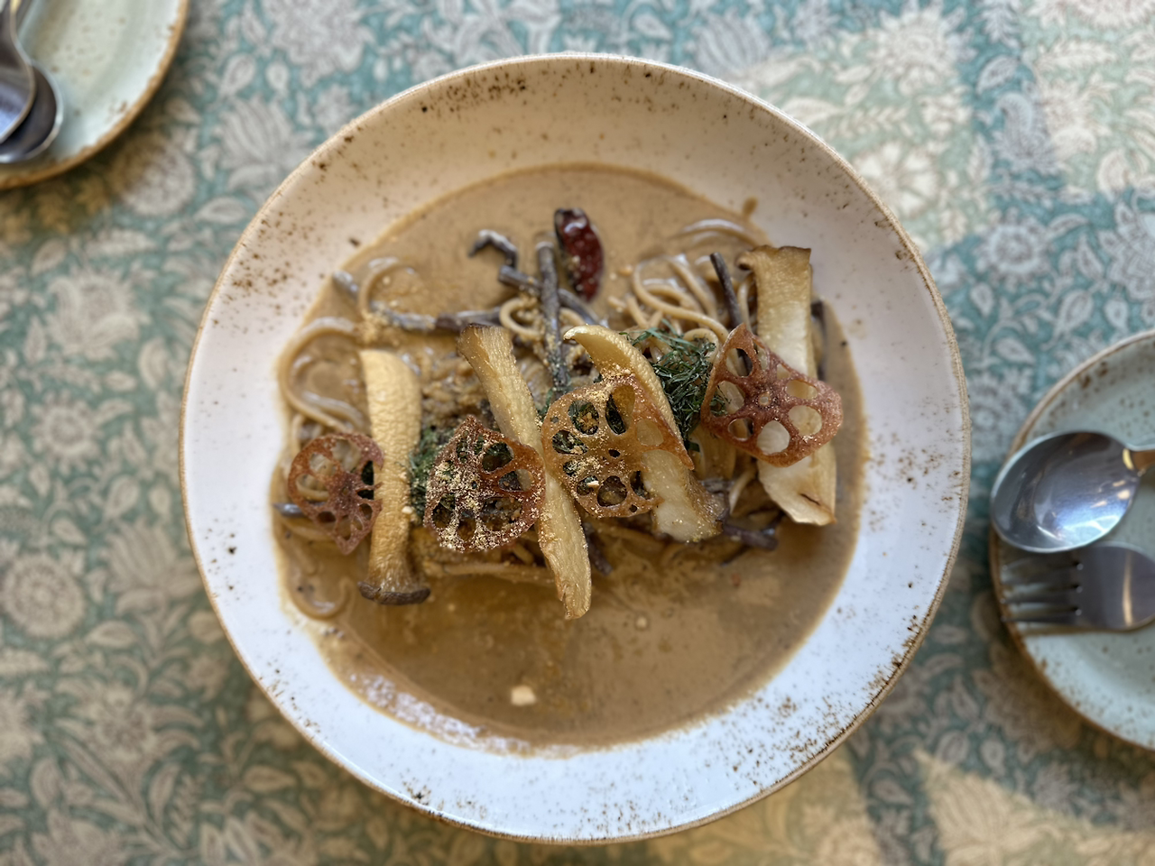 그다음으로 나온 캐슈넛 크림 파스타가 나왔다. 큼직한 새송이 버섯과 바삭한 연근칩이 올라갔고 옅은 갈색의 크림으로 덮인, 난생처음 보는 크림 파스타였다. 캐슈넛으로 크림을 만들다니 놀라울 따름이었는데, 검색해 보니 캐슈넛으로 크림치즈를 만들어 먹는 사람들이 꽤 있었다.
